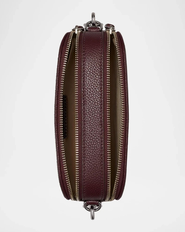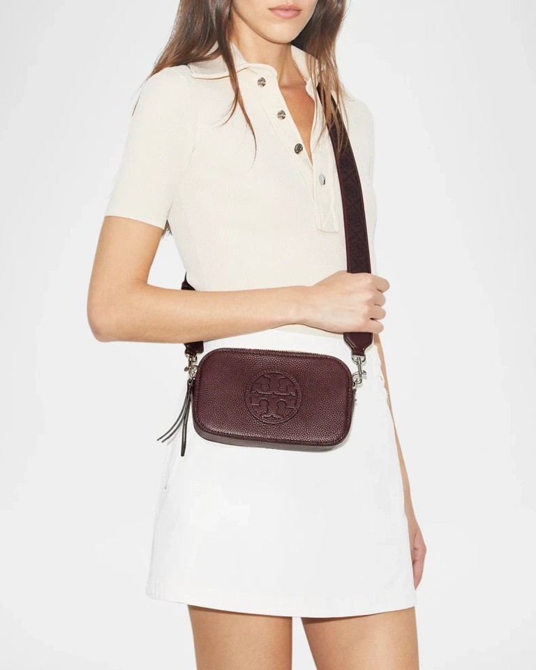 Tory Burch "Miller" leather camera crossbody bag with cutout T monogram accent Detachable, adjustable web crossbody strap Double zip top closures Interior, one slip pocket Lining: Nylon/polyurethane Approx. 4.5"H x 7.7"W x 2.2"D Spot clean Imported