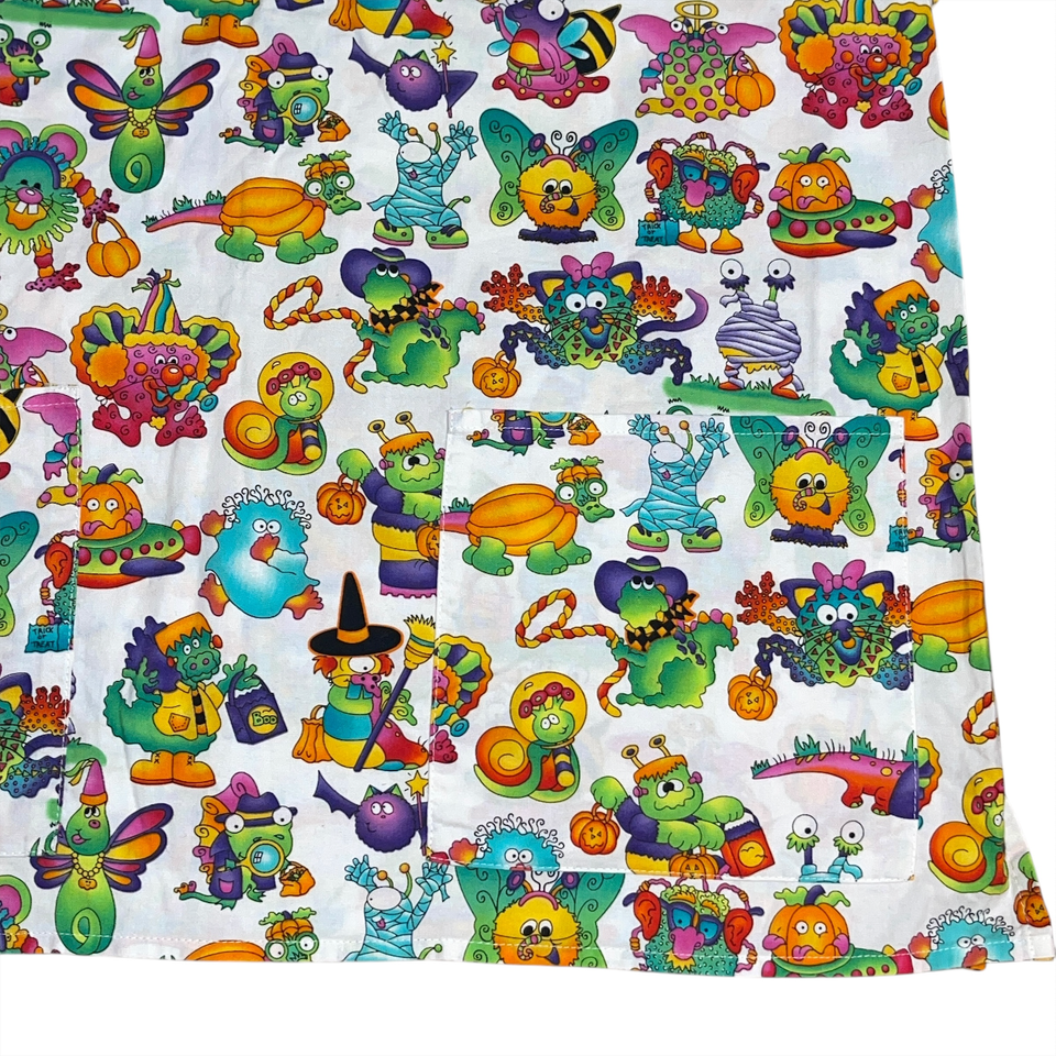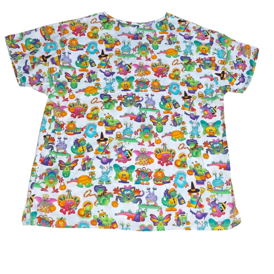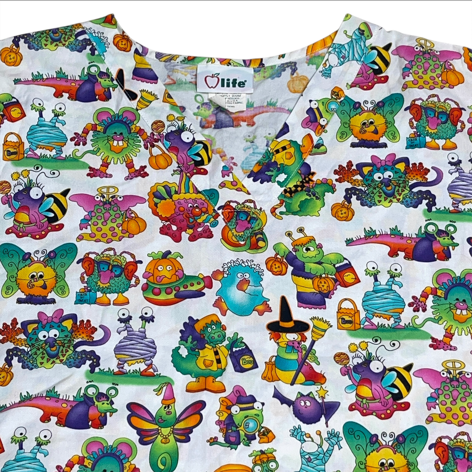 Life Uniform Whimsical Crazy Monsters Clowns Butterflies Large White Scrub Shirt