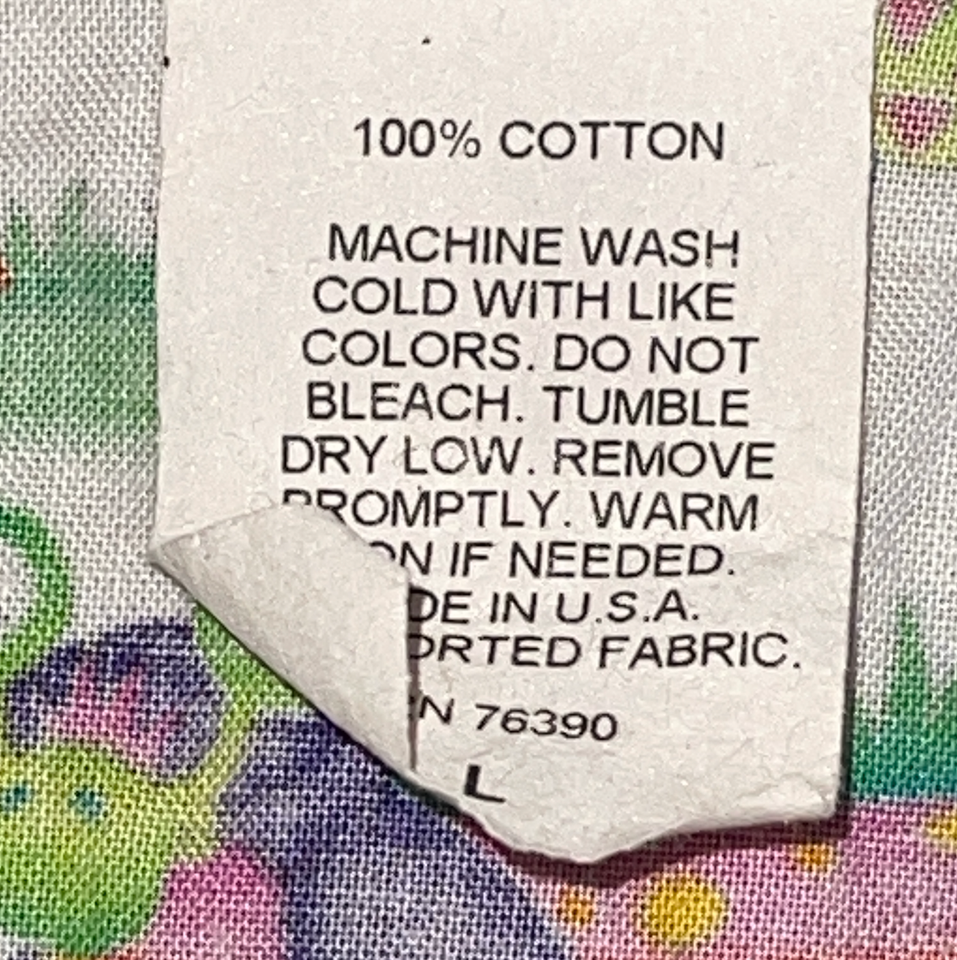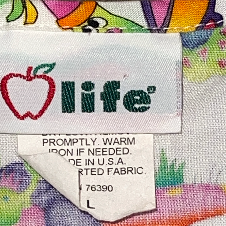 Excellent condition. Super cute and vibrant. Size tag L large. Measures 23 inches across the chest and 27.5 inches overall length. Features: Soft cotton, v neck, front lower pockets, straight back. Made in USA. Please see all gallery photos. Super fun scrub would be great for a pediatric unit. Perfect for a nurse, vet, xray tech, lunch worker, etc. etc. We are a smoke free, pet friendly home. Have a great day!
