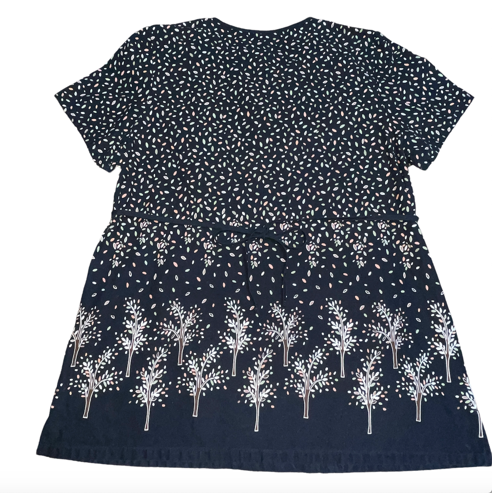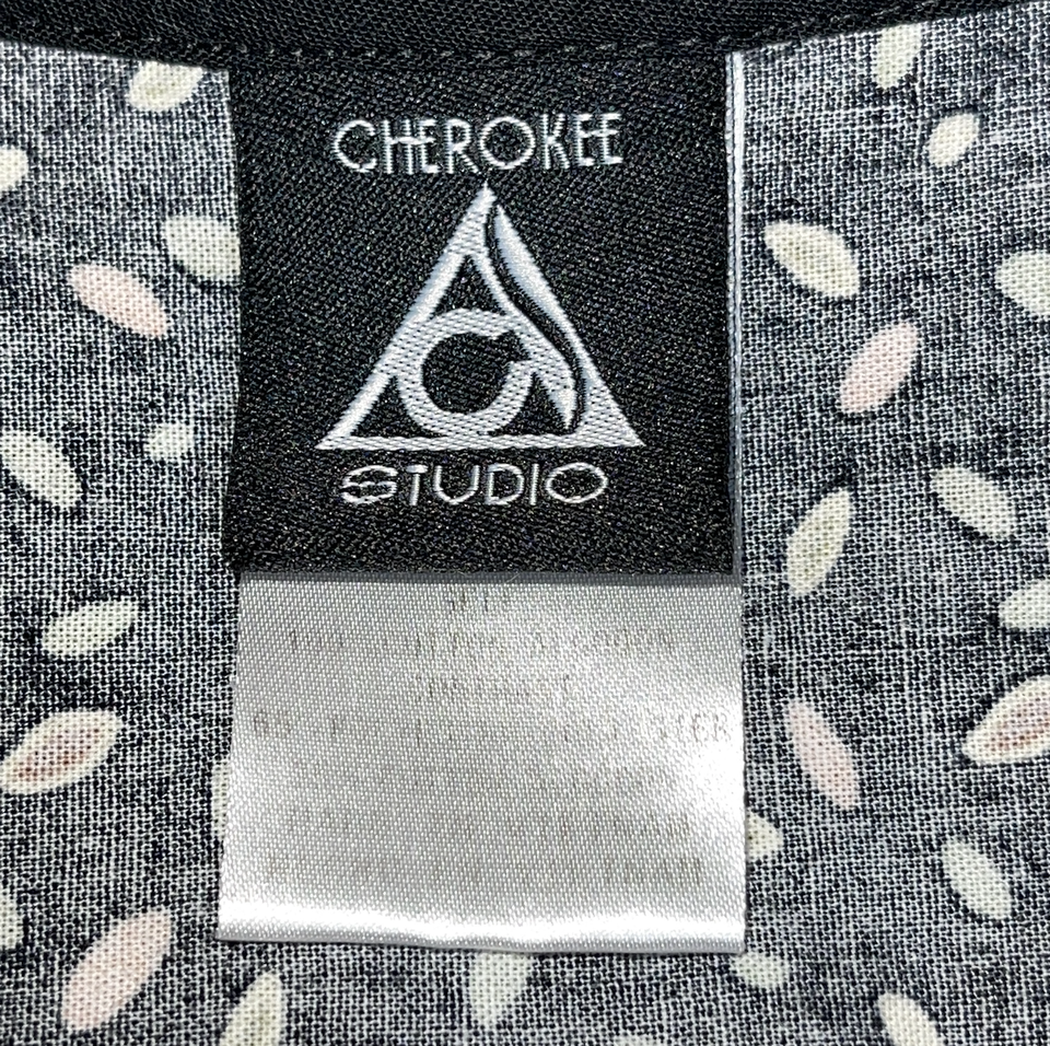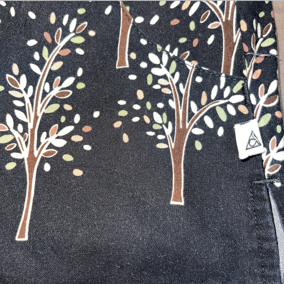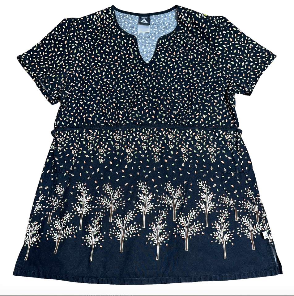Cherokee Studio Scrub Top Shirt Womens Medium Black Brown Leaves Trees Fall READ