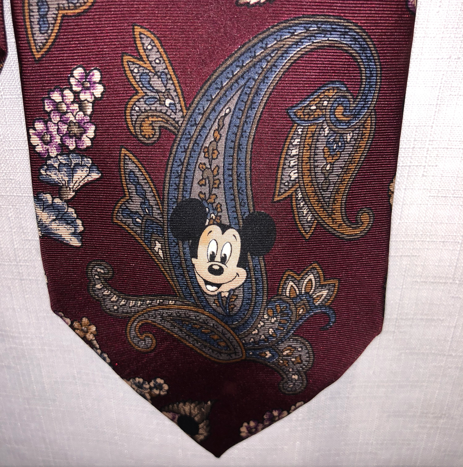 EUC The Disney Store 100% Men's SILK Tie Paisley Mickey Mouse Burgundy Tan Blue