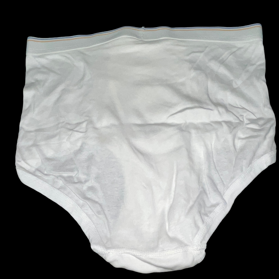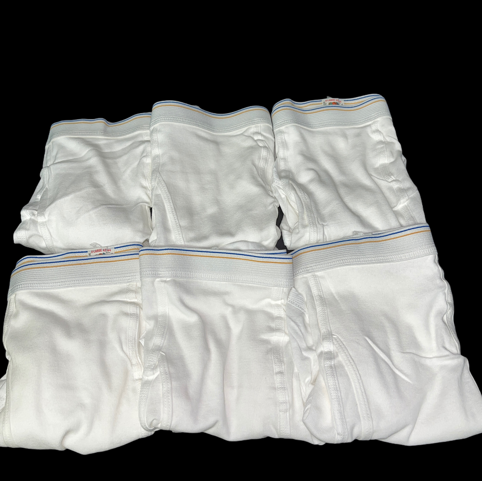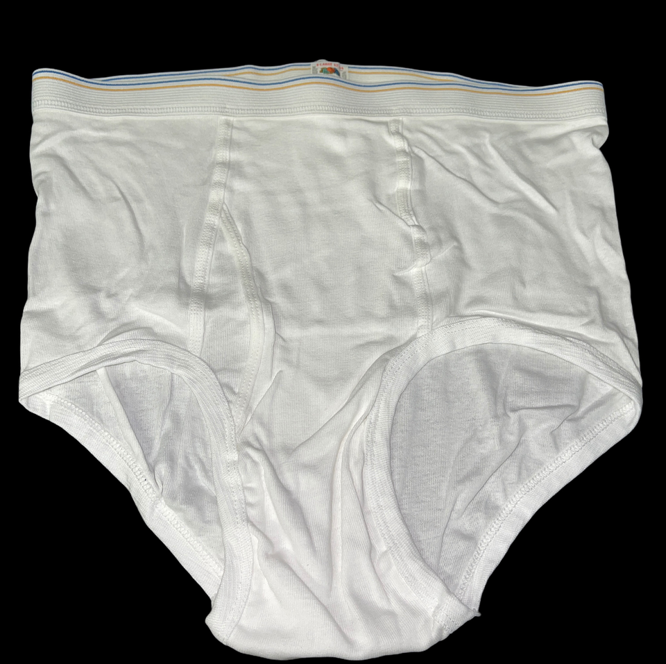 6 PAIRS Vintage FRUIT OF THE LOOM Briefs Men's White underwear briefs 100% Cotton Made in USA. Dead stock, new without tags. New old stock out of package 6 pairs. Size XL 42 - 46, actual measurements in photos. White with blue and gold stripe. Please see all photos. We are a smoke free, pet friendly home. Have a great safe day!