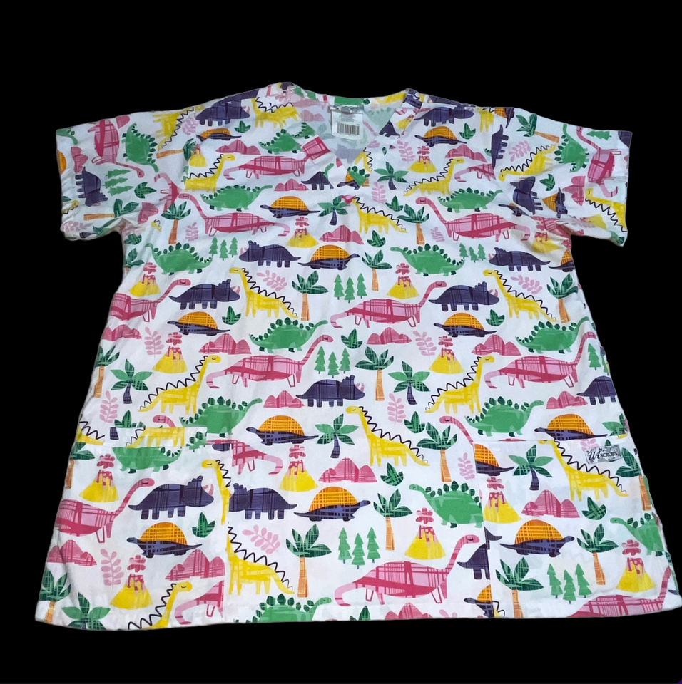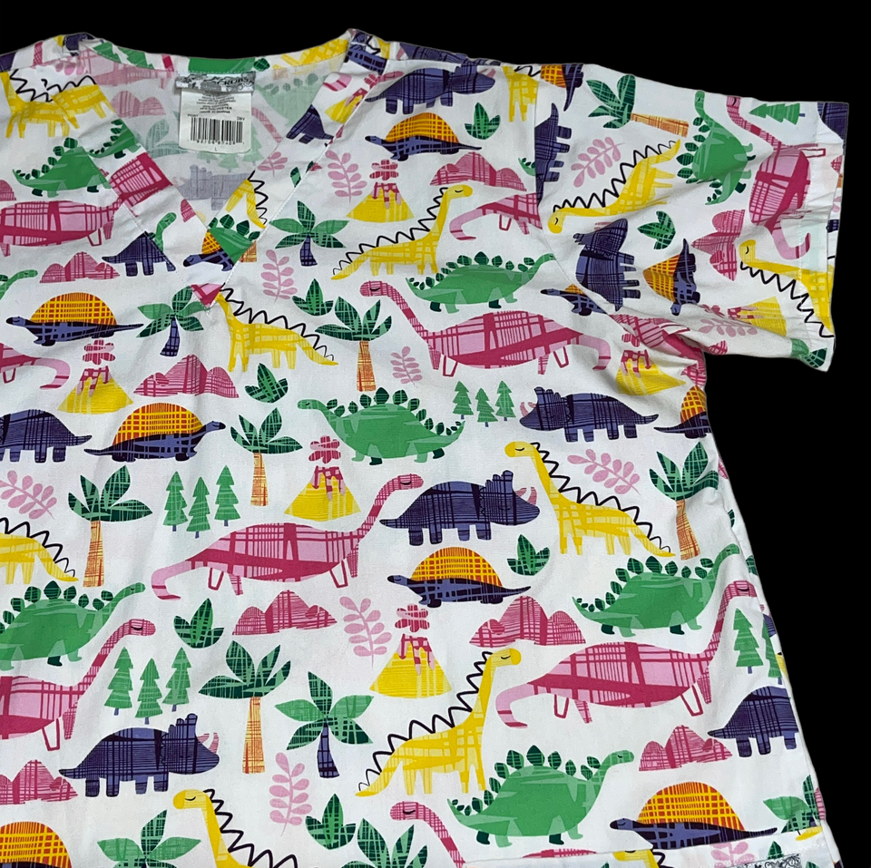 Uniform Advantage Size Large Dinosaur Dino Floral Scrub Shirt White Pink Blue