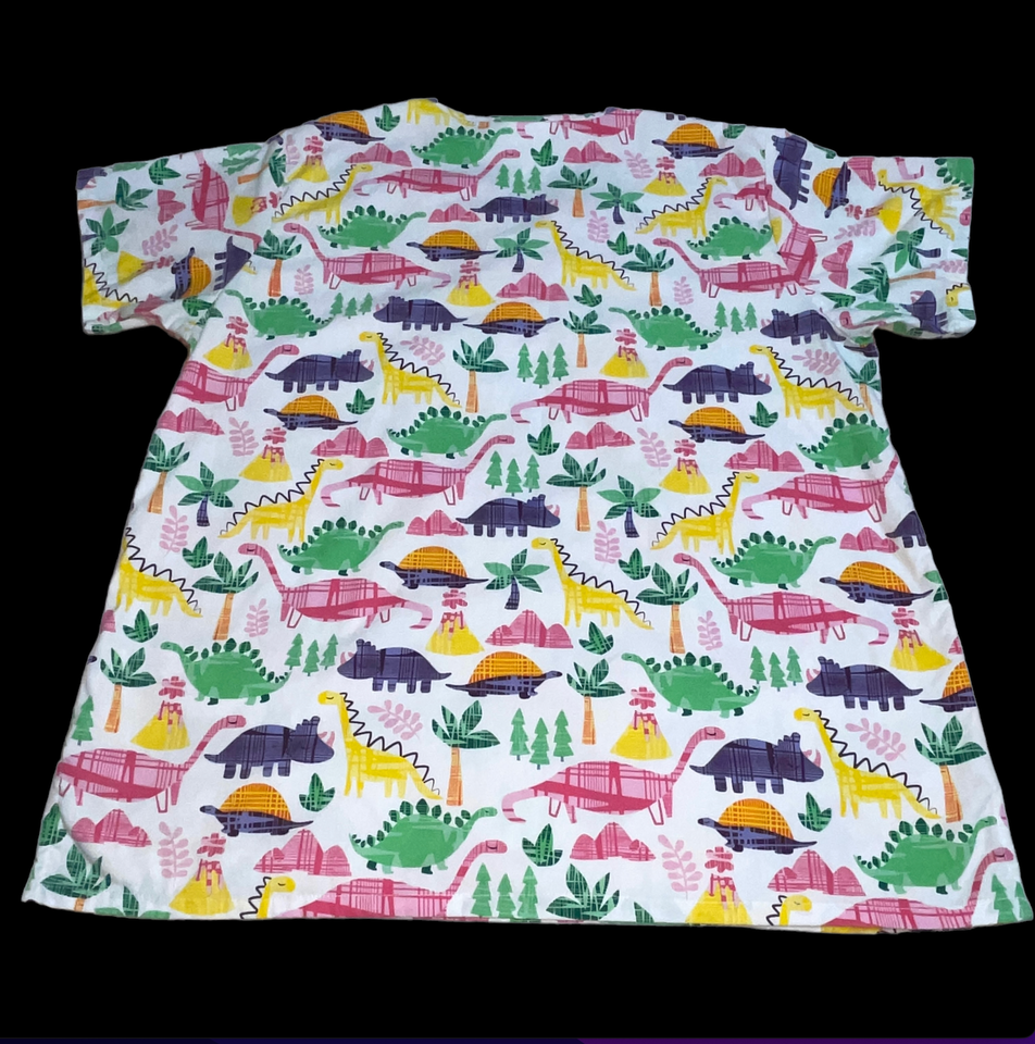 Very good condition. Size tag L Large. Measures 24 inches across the chest and 28 inches overall length. Features: Cotton blend, v neck, front lower pockets, straight back. Super cute fun dinosaur print, perfect for pediatric care!Please see all photos. We are a smoke free, pet friendly home. Have a great day!