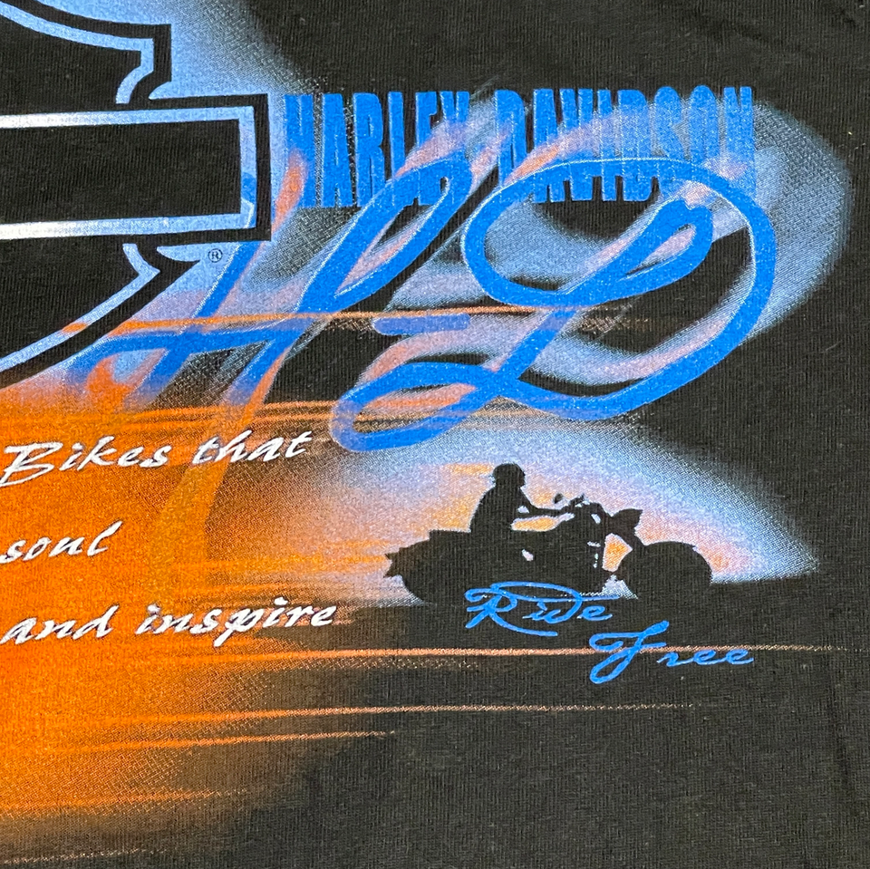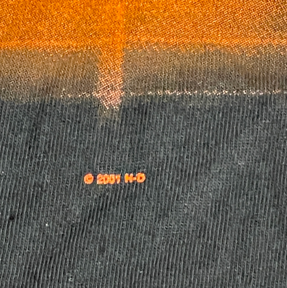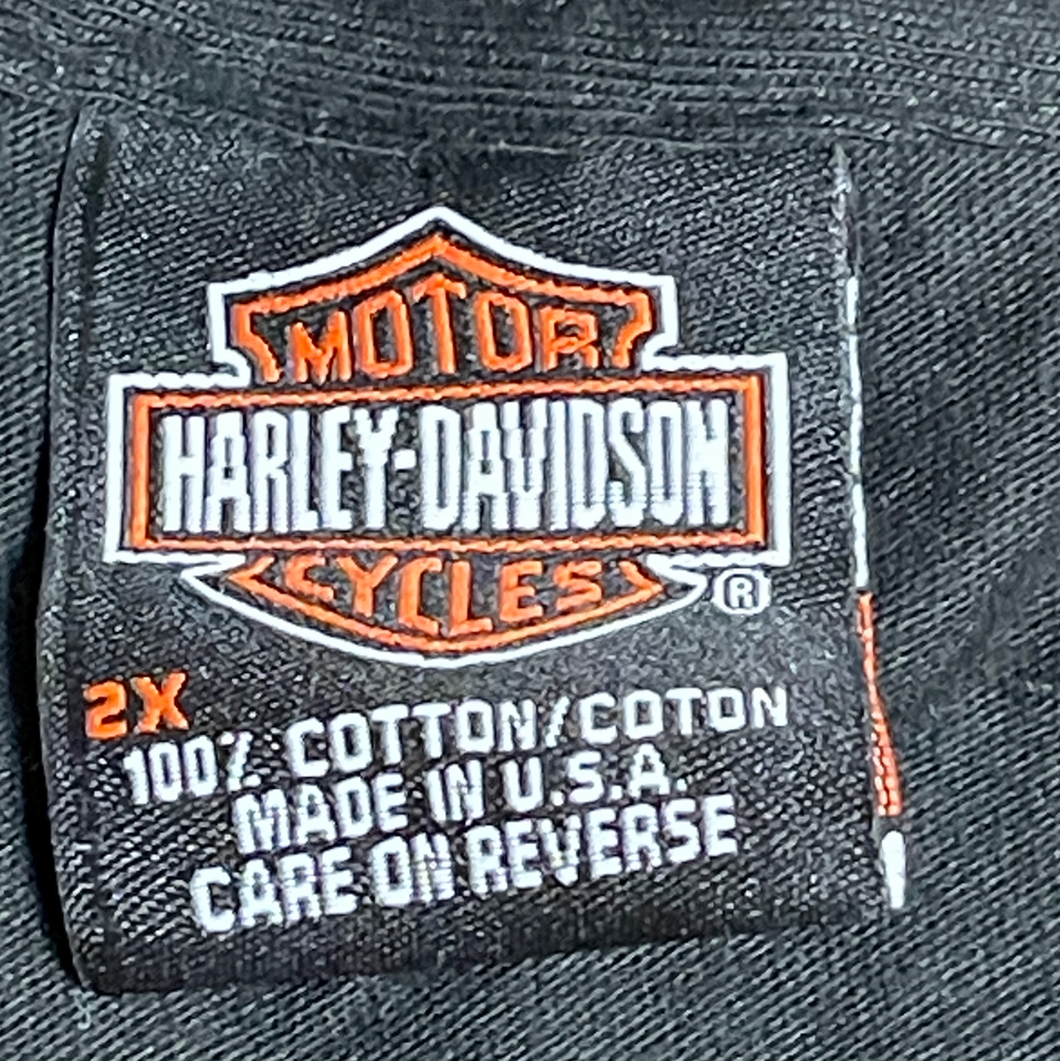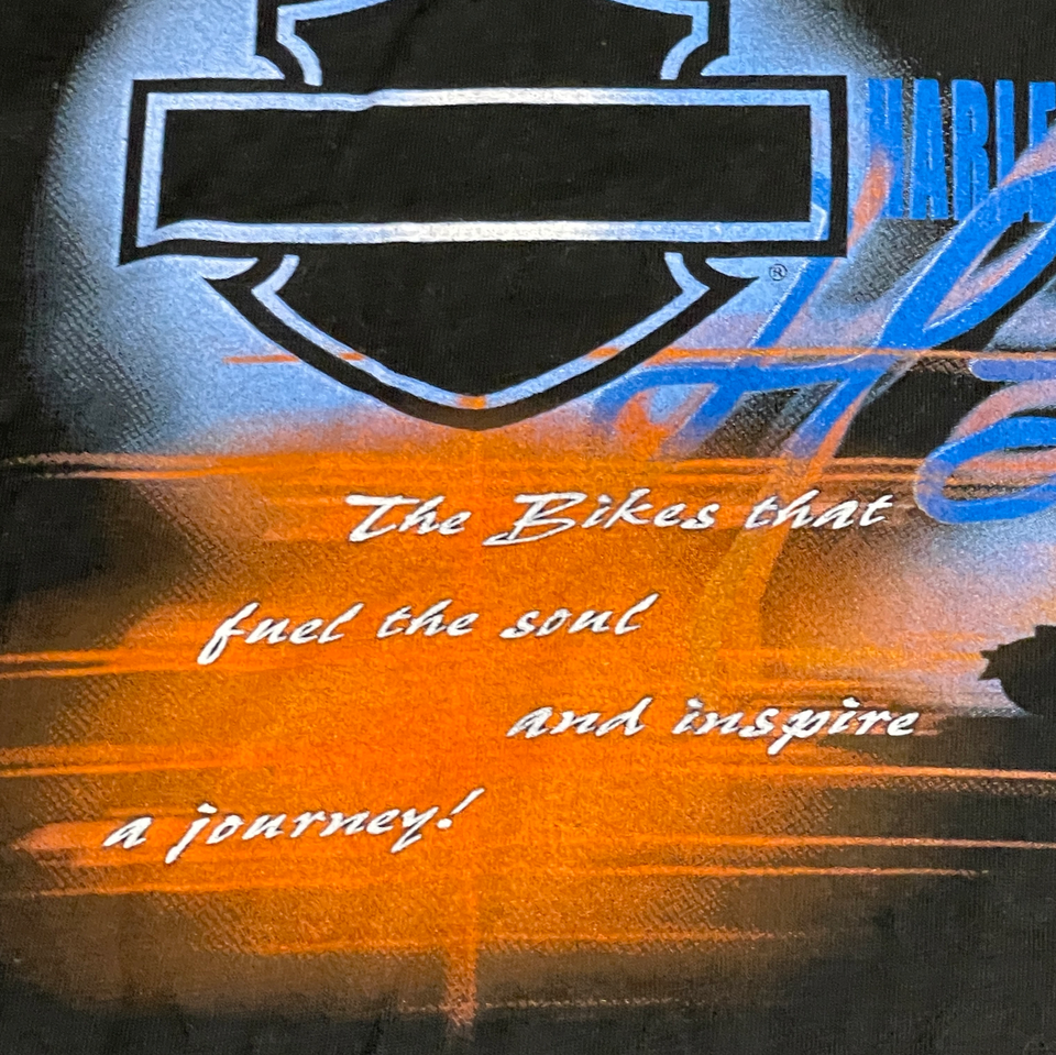 Looks to be new old stock. Estate find and does not appear to have ever been worn. Made in USA. HD 2001. Double sided graphics. Front side says: Harley Davidson The Bikes that fuel the soul and inspire a journey. Back side: Harley Davidson Store Roma, Italy. Size tag 2X 2 extra large. Measures 26 inches across the chest and 32 inches overall length. Please see all gallery photos. We are a smoke free, pet friendly home. Have a great day!