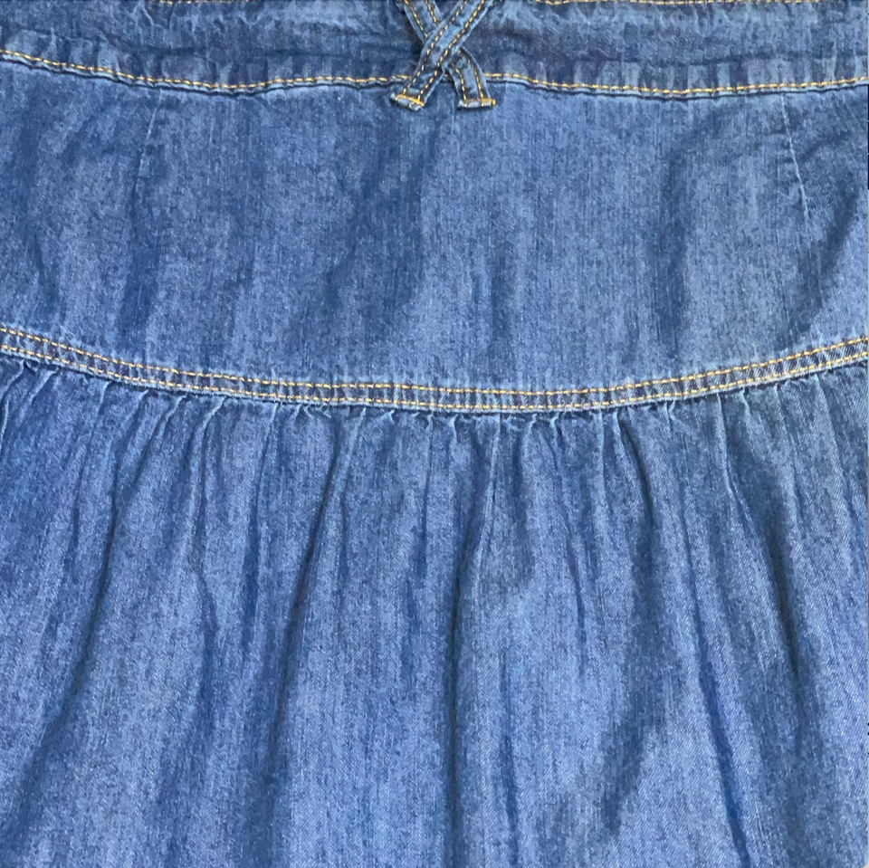 Great condition denim blue jean ruffle skirt. Womens plus size 16. Laying flat, measures 18 inches across the waist and 29.5 inches overall length. Super cute skirt! Perfect for summer festivals, events, or a casual night out! Features: Full button up front, belt loops, cotton material. Please see all gallery photos. We are a smoke free, pet friendly home. Have a great day!