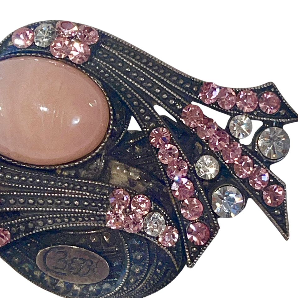 Estate sale find. Excellent condition. Super cute fashion brooch pin. It's signed on front looks like bebe, but I am not sure. This is great for someone who likes pink! Please see all gallery photos. We are a smoke free, pet friendly home. Have a great day!