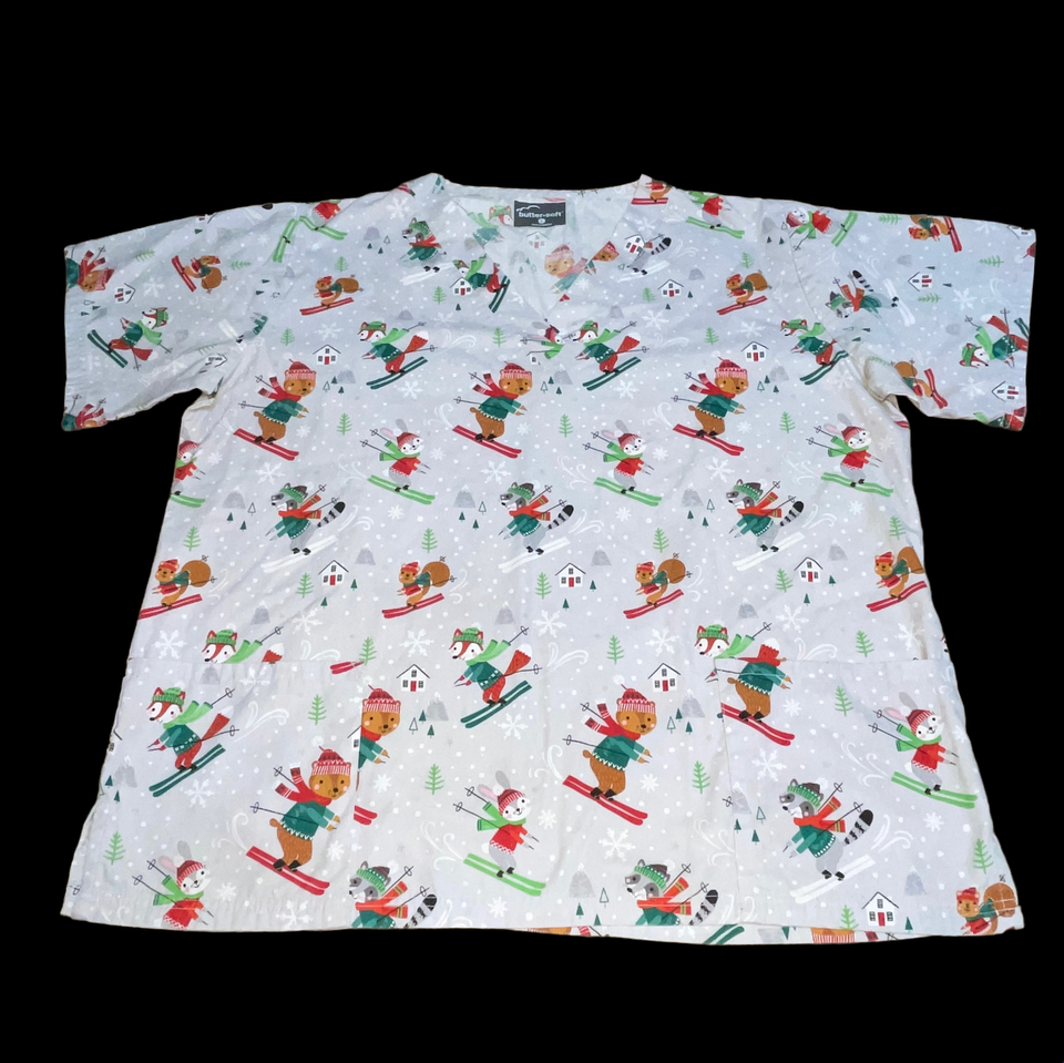 Very good condition. Size tag L Large. Measures 25.5 inches across the chest and 27.5 inches overall length. Features: Cotton blend, short sleeve, v neck, front lower pockets, straight back. Super cute scrub shirt top! Fun woodland friends skiing print! Please see all gallery photos. We are a smoke free, pet friendly home. Have a great day!
