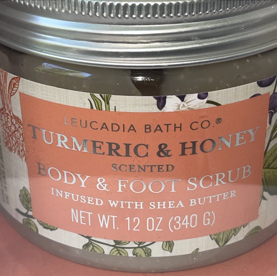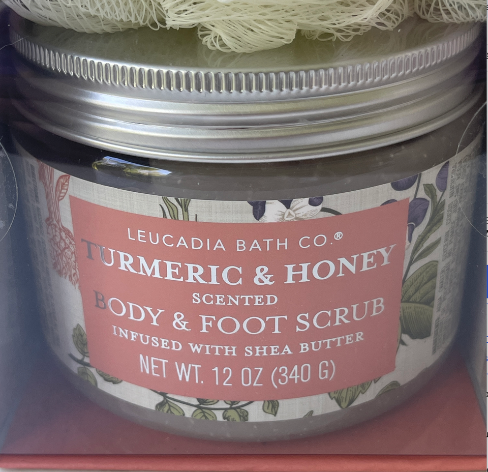 New Leucadia Bath Co body foot scrub mesh puff. Turmeric honey 12 ounce. Please see all gallery photos. We are a smoke free, pet friendly home. Have a great day!
