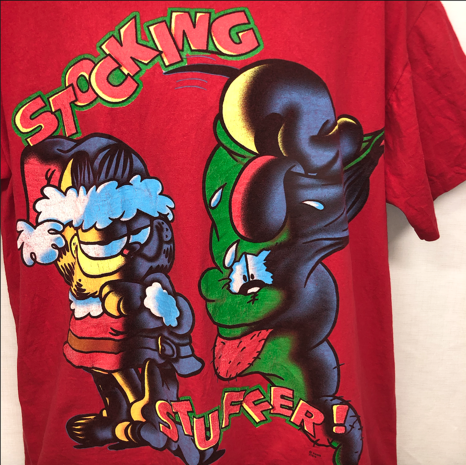 Vintage Garfield Odie Red Stocking Stuffer Christmas Holiday Tee Shirt USA Made