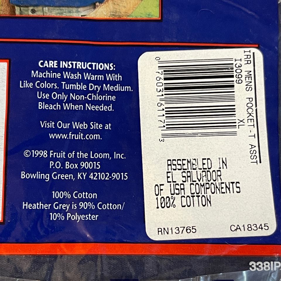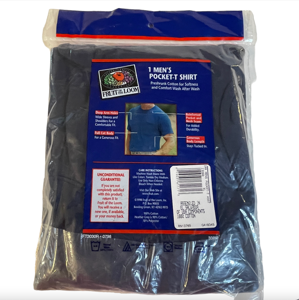 New old stock. Men's size XL extra large (46 to 48). Navy blue. Fruit of the Loom Pocket T Shirt. Slightly imperfect. Assembled in El Salvador of U.S.A components. 100% cotton preshrunk. Packaged dated 1998. Please see all gallery photos. We are a smoke free, pet friendly home. Have a great day!