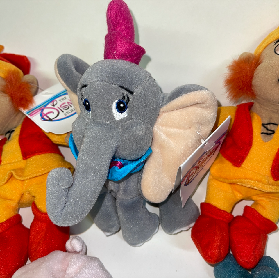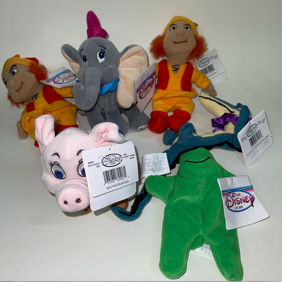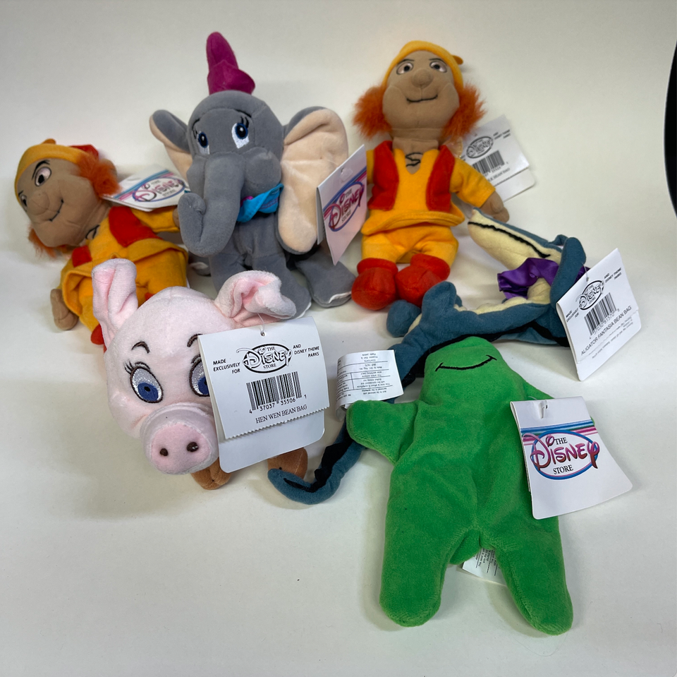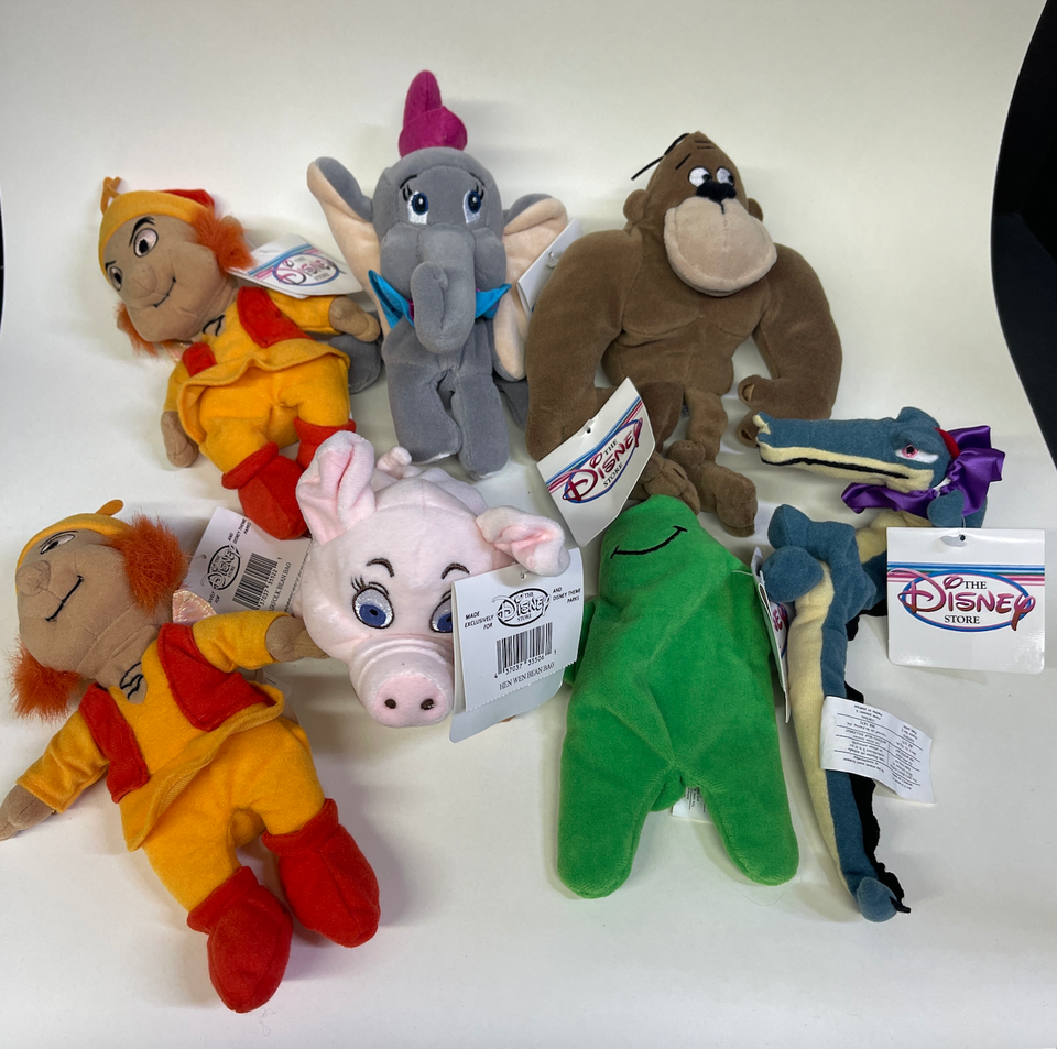 These are new but paper tags are slightly wrinkled. Includes 7, one duplicate. All are small mini 6 inches. Includes: 2- Fairfolk, Aligator Fantasia, Ape, Flubber (NO sound), Hen Wen, and Dumbo.