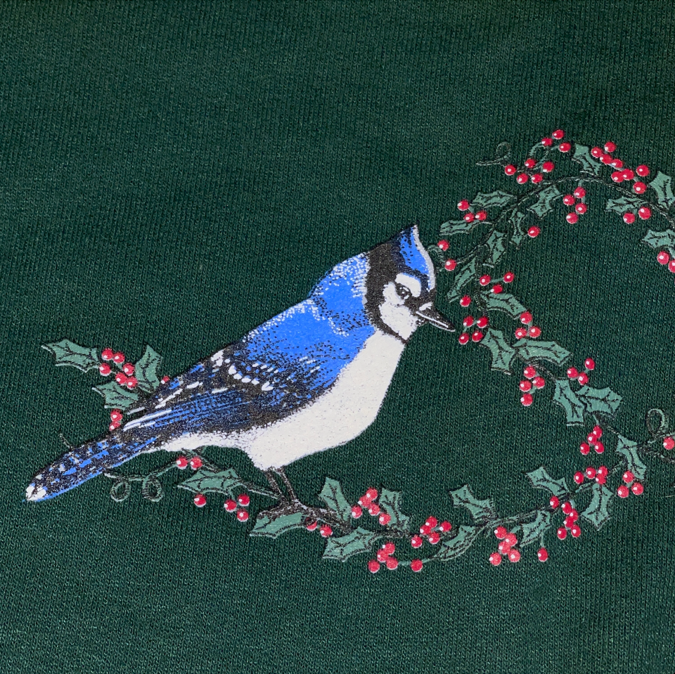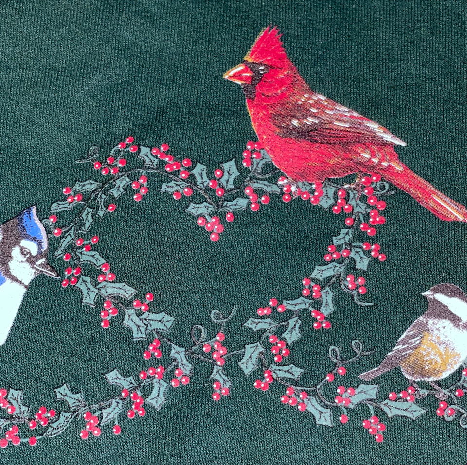 Y2K Green Christmas Sweater Medium Cardinal Blue Bird Holly Sweatshirt Jerzees