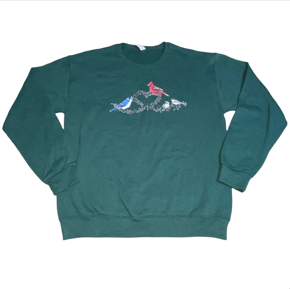 New without tags. Grandma core pullover sweatshirt. Cardinal, blue bird, chickadees bird, Christmas holly heart graphic print. Hunter green color. Size tag M medium. Measures 22 inches across the chest and 27 inches overall length. Please see all gallery photos. We are a smoke free, pet friendly home. Have a great day!
