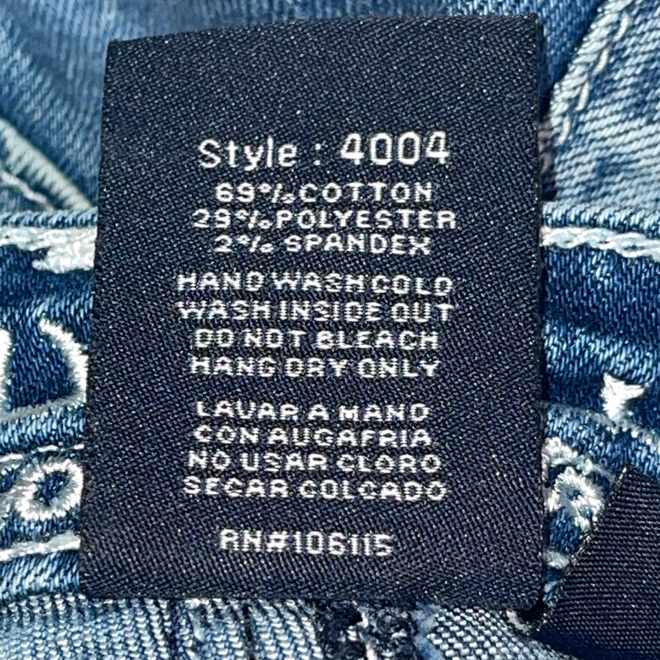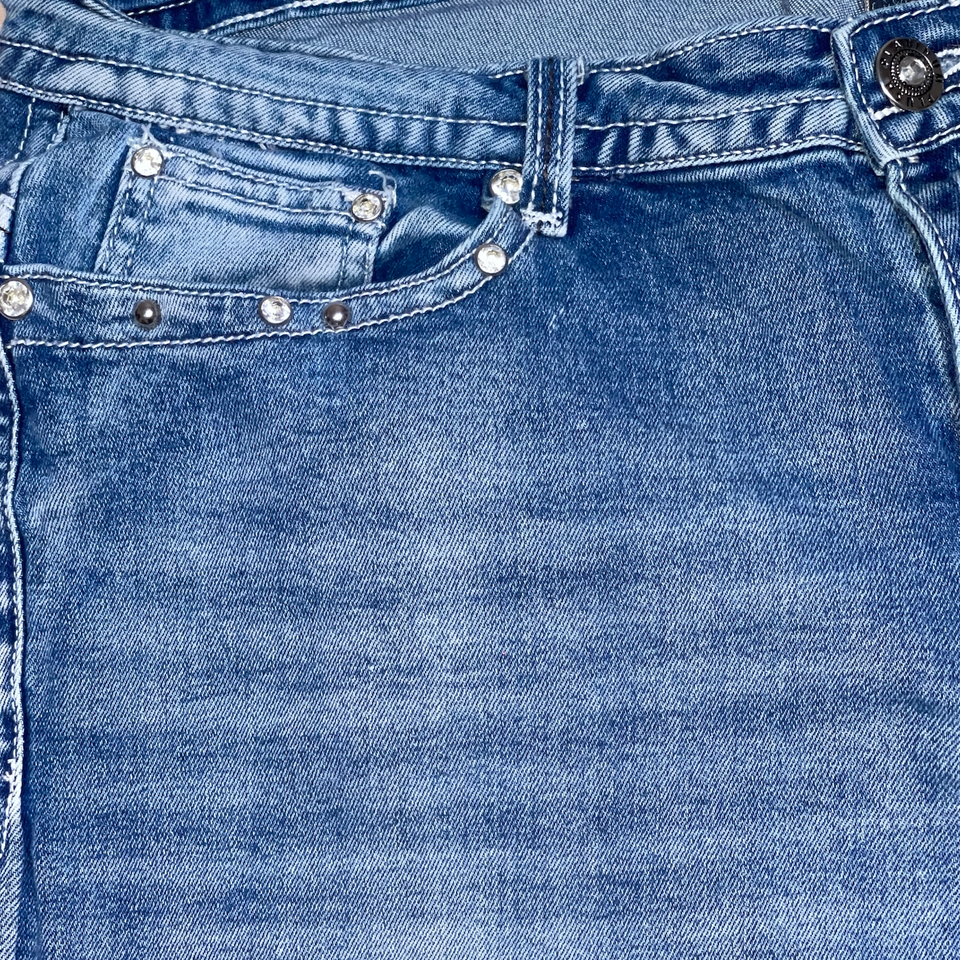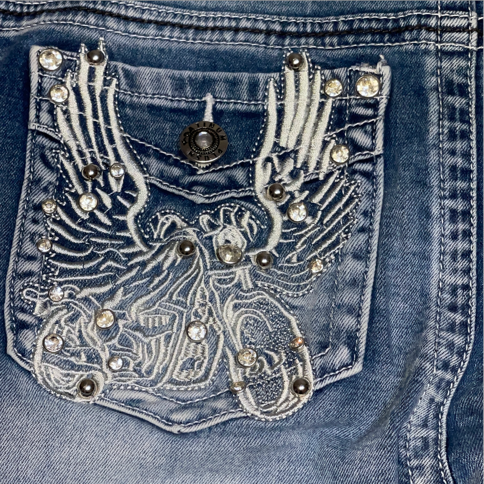 Overall very good condition. Women's size 13, full measurements in last photo. Super cool pair of bling jeans with cycle pattern on back pockets. Has some stretch. Style 4004. Please see all gallery photos. We are a smoke free, pet friendly home. Have a great day!