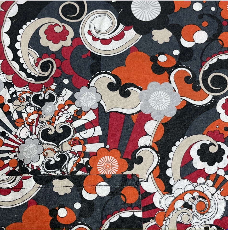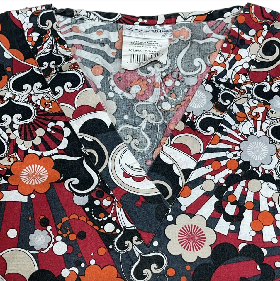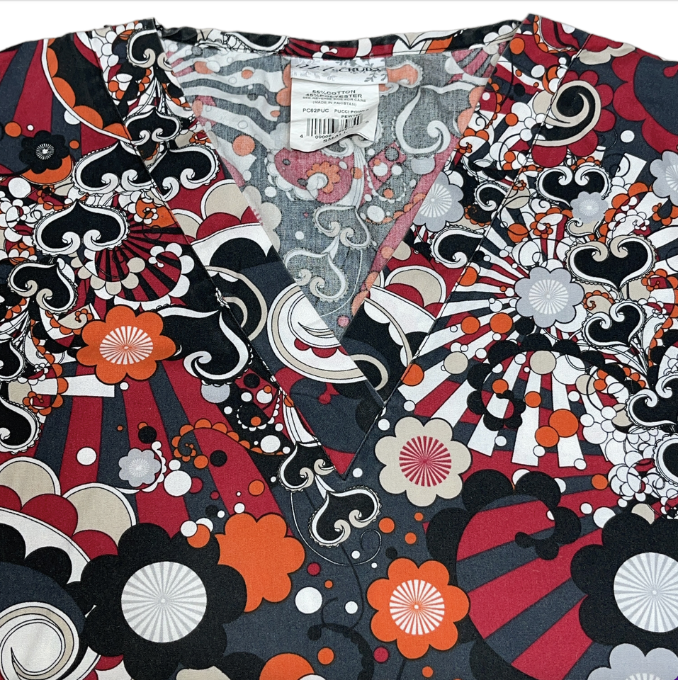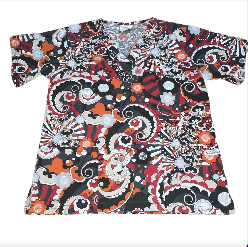 UA Size S Small Black Gray Red Orange Paisley Floral Vibrant Scrub Shirt Nurse