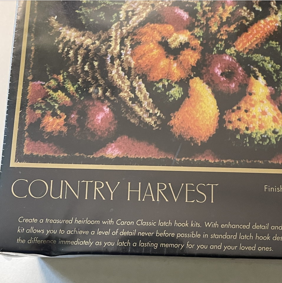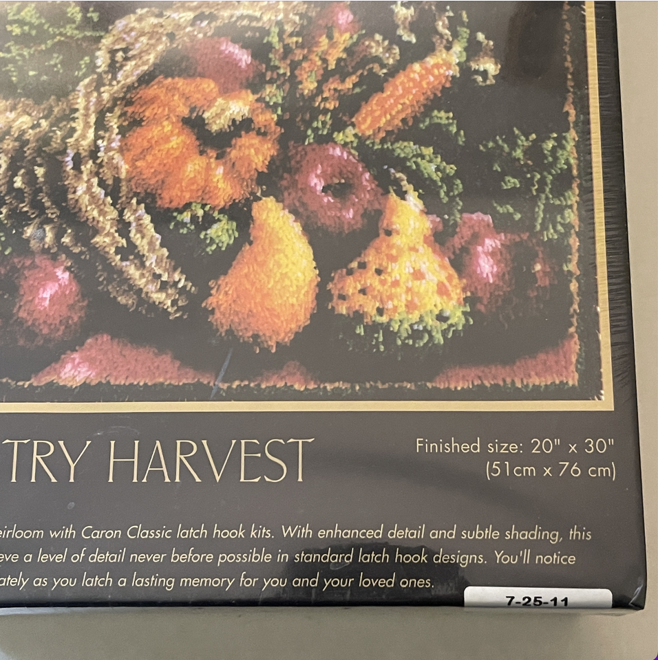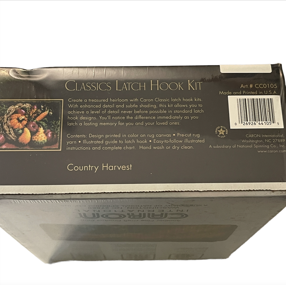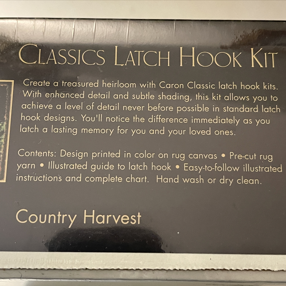 Caron Classics Latch Hook Kit, 20 X 30, Brand New, Art# CC0105, Country Harvest. Kit is new sealed in the box, box has a few light dents. Latch hook tool is not included. Please see all gallery photos. We are a smoke free, pet friendly home. Have a great day!