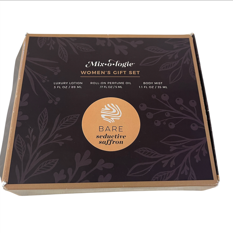 New women's gift set. Open box and box has dings and blemishes, but all products are new. Bare Seductive Saffron set includes 1 of each: 3 ounce luxury lotion (sealed), .17 ounce roll-on perfume oil and 1.1 ounce body mist. Please see all gallery photos. We are a smoke free, pet friendly home. Have a great day!
