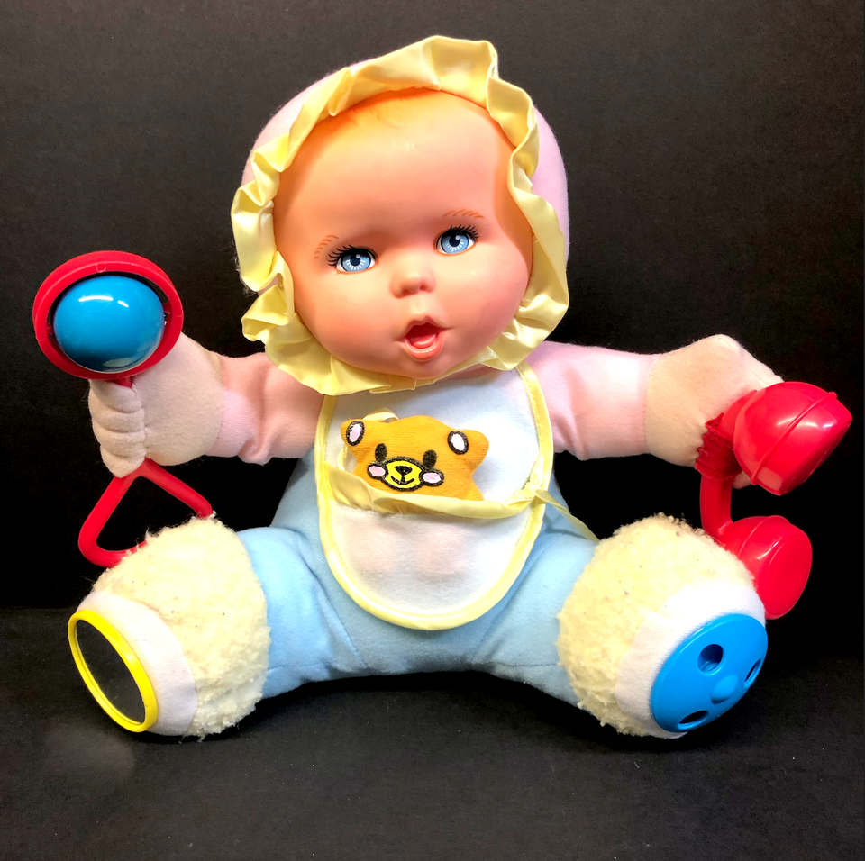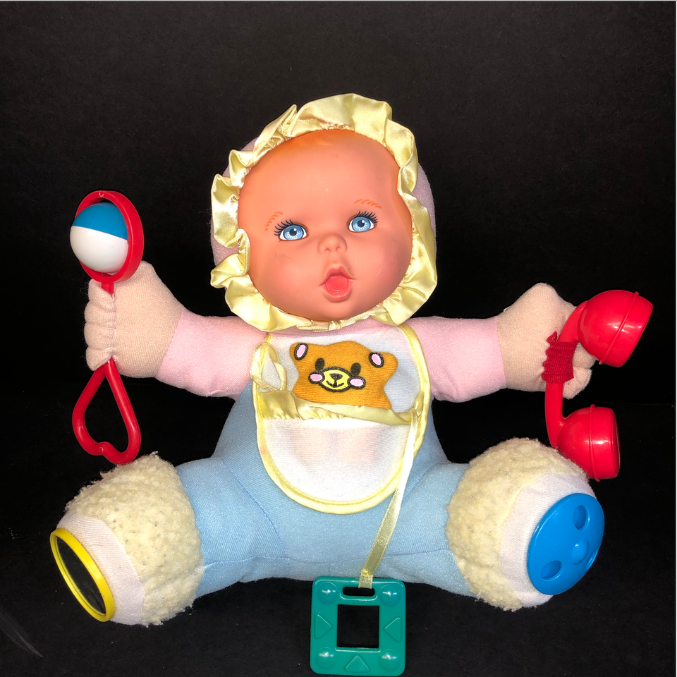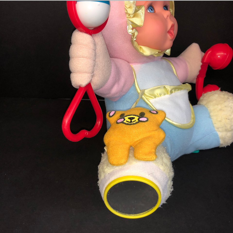 Vintage 1997. She's freshly laundered, has a few very light marks on her face and spot on her pocket. Overall she's in good condition. She has a squeaker plush attached, rattle, mirror, activity lovey doll. Please see all photos. We are a smoke free, pet friendly home. Have a great safe day!