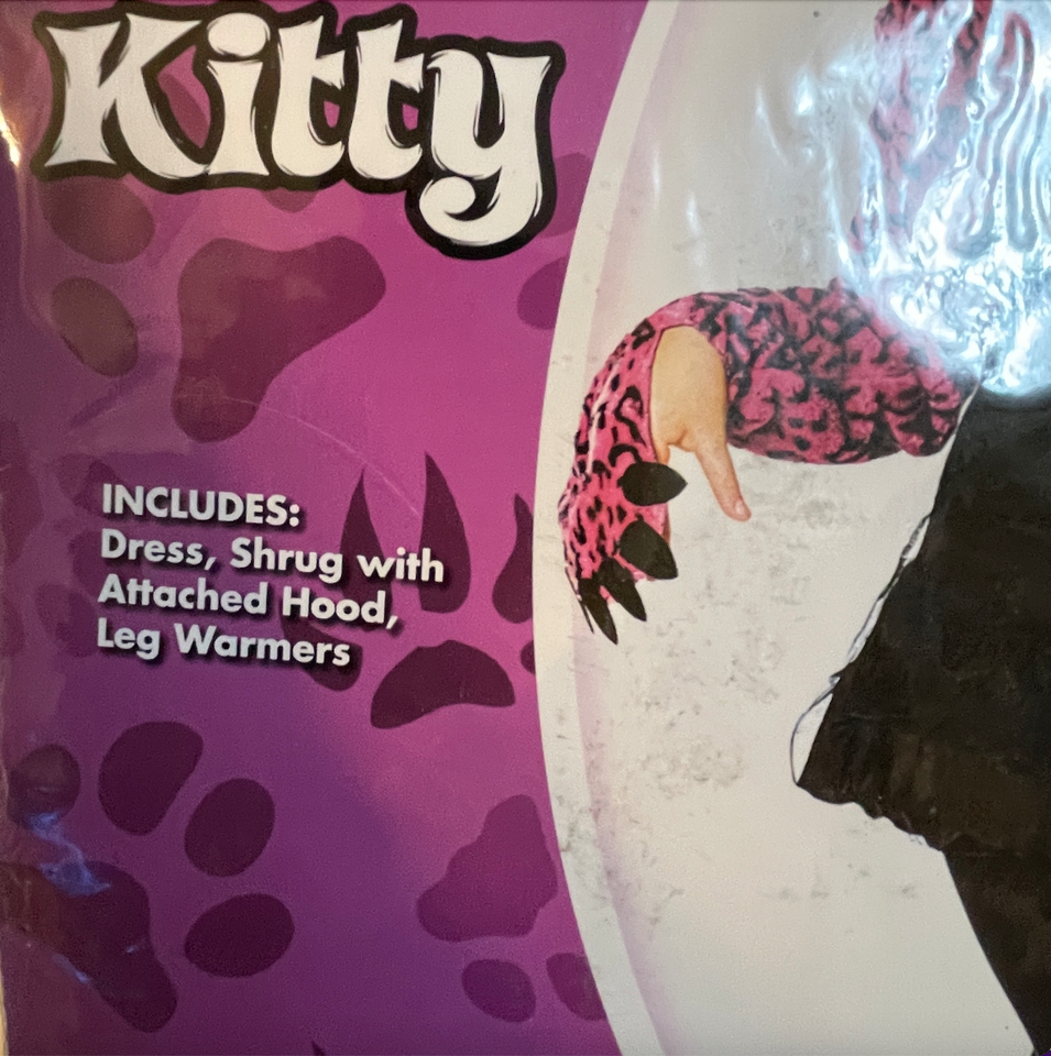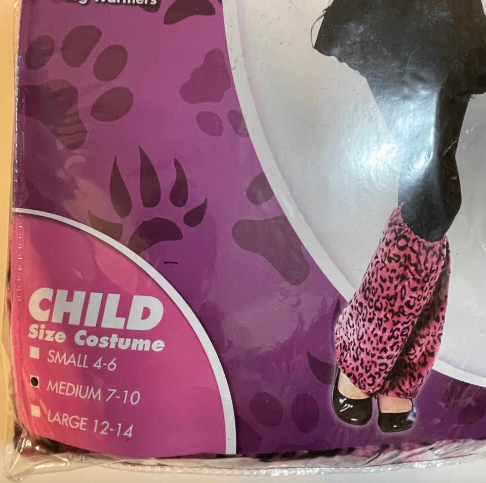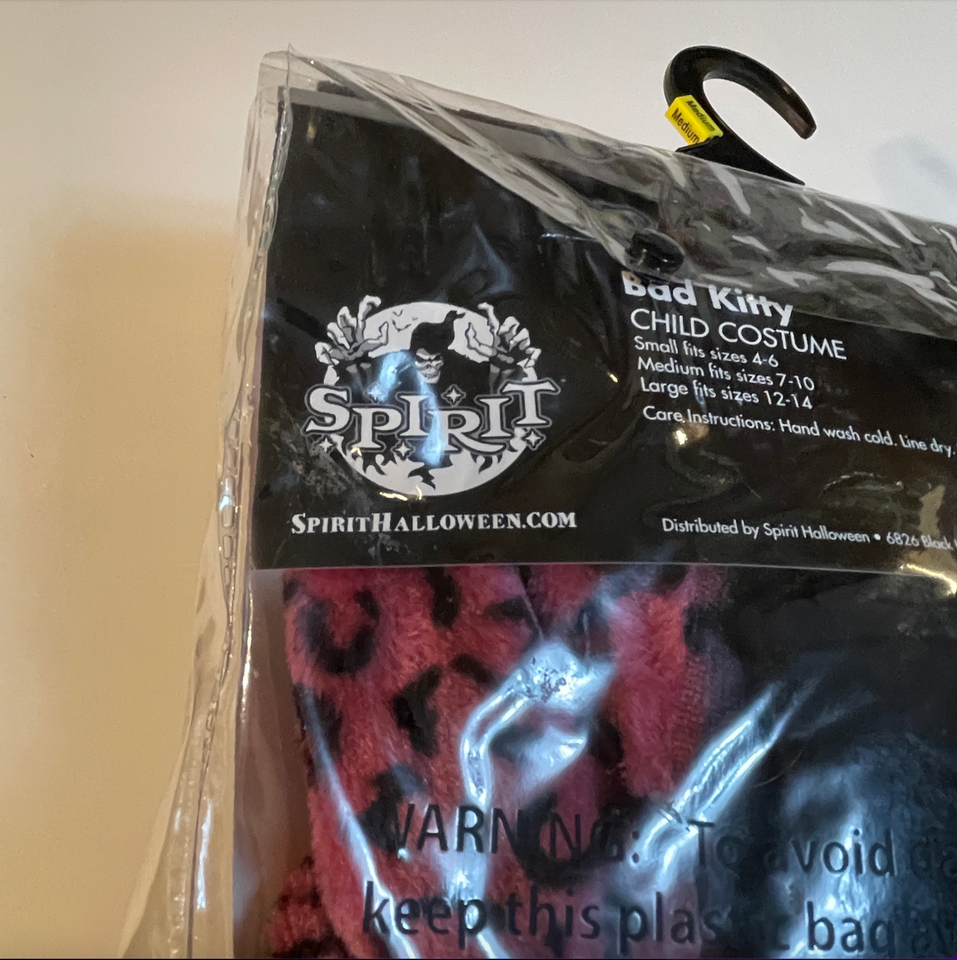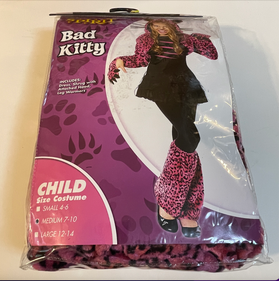 New in package. Pink Black Leopard "Bad Kitty" costume. Size tag Medium 7 to 10 girls. Set includes: Dress, Shrug with attached hood, leg warmers. Please see all gallery photos. We are a smoke free, pet friendly home. Have a great day!