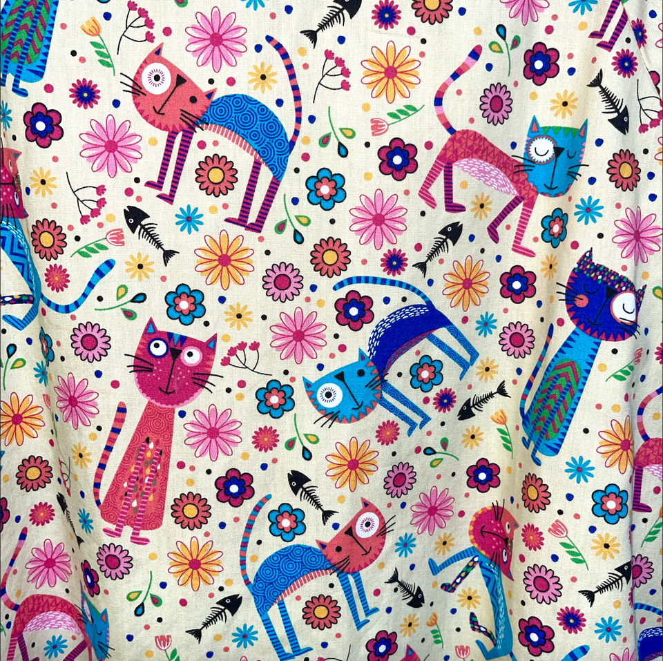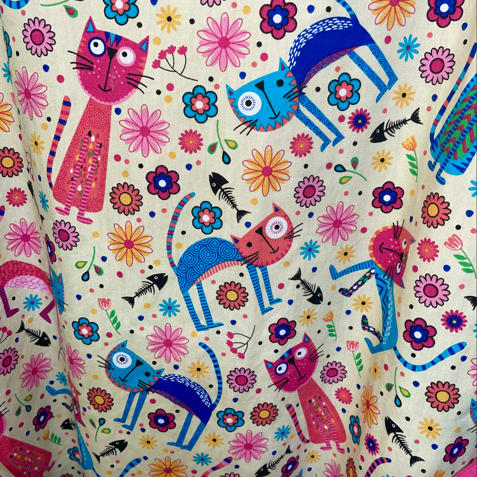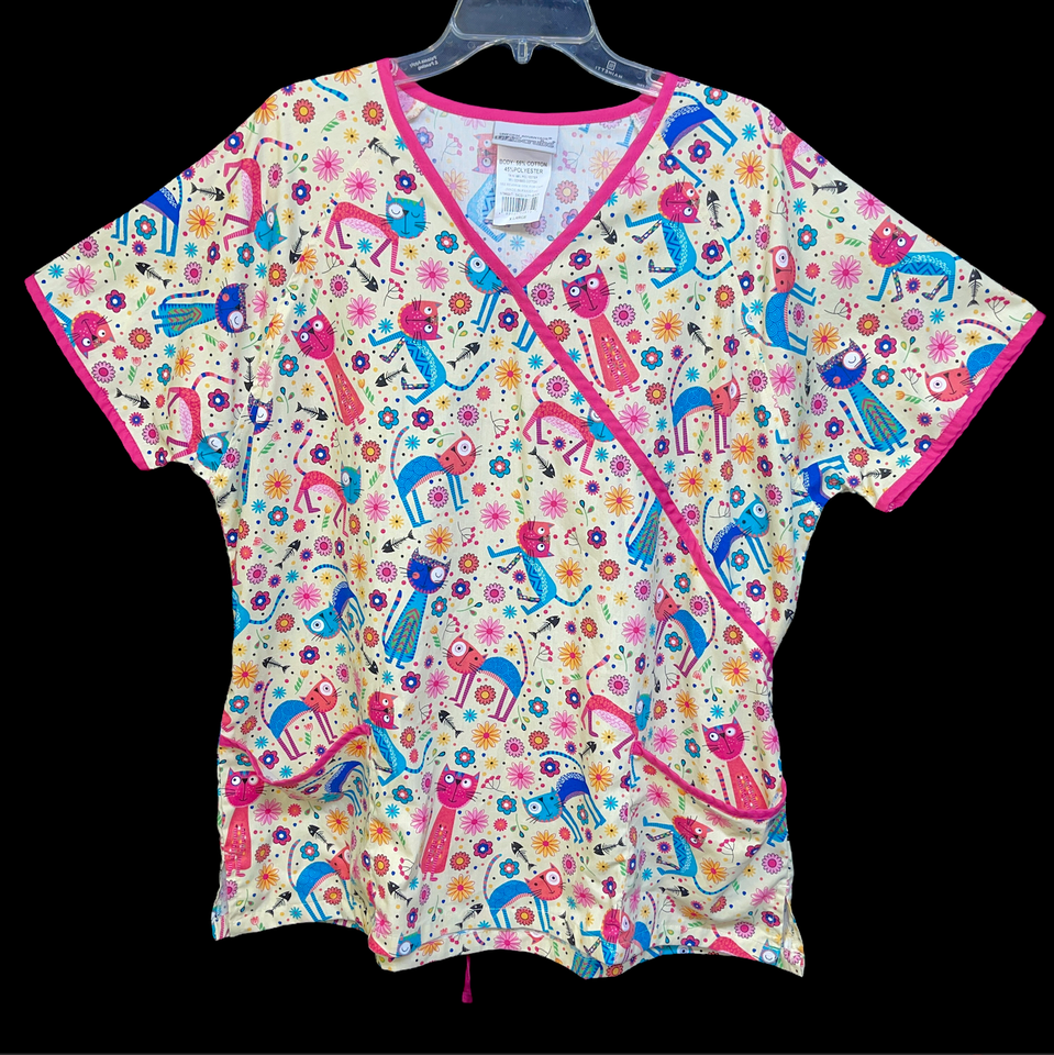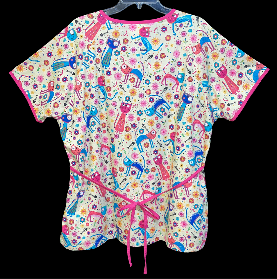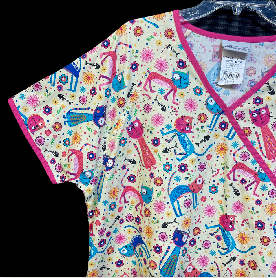 Great condition. UA uniform advantage. Size tag XL extra large. Measures 25 inches across the chest and 29.5 inches overall length. Super pretty bright and vibrant print. Cats and flowers. Pattern reminds me of Laurel Burch, is named "Sassy Kitty". Features: V neck, front lower pockets, tie back. Please see all photos. We are a smoke free, pet friendly home. Have a great safe day!