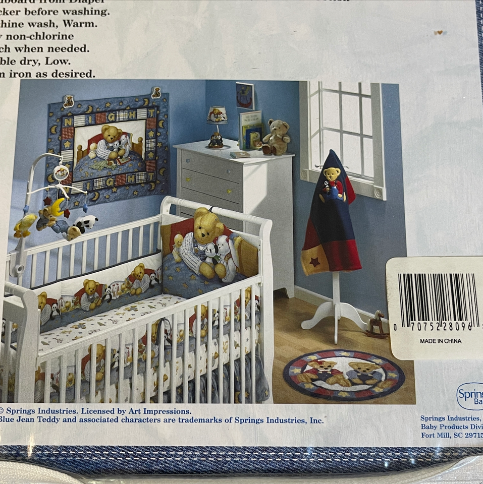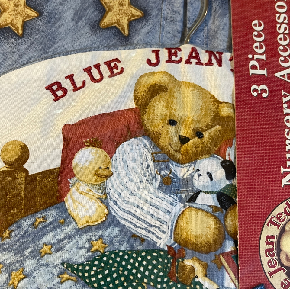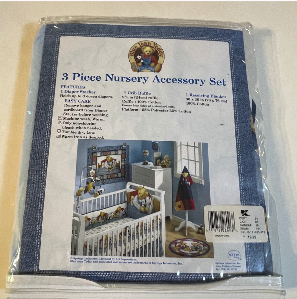 New in package old stock. Vintage 3 piece nursery accessory set. Includes: 1 diaper stacker (holds up to 3 dozen diapers), 1 crib ruffle (covers 4 sides of a standard crib), and 1 receiving 100% cotton receiving blanket (30 inches by 30 inches). Please see all gallery photos. We are a smoke free, pet friendly home. Have a great day!