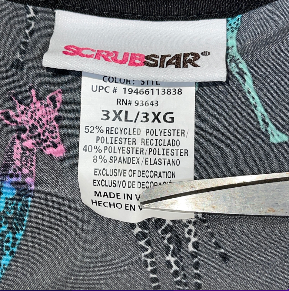 Excellent condition. Size tag 3XL 3 extra large. Measures 28 inches across the chest and 29 inches overall length. Please see all gallery photos. Features: poly spandex mix, short sleeve, v neck, lower front pockets. Super cute scrub shirt top! Very bright vibrant perfect for nurse, vet, tech, X-ray, etc. Living the High Life Stand Tall! We are a smoke free, pet friendly home. Have a great day!