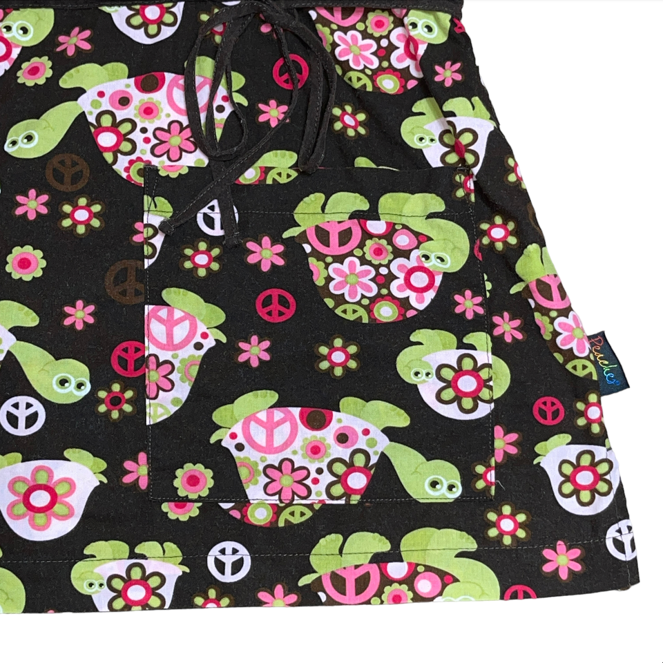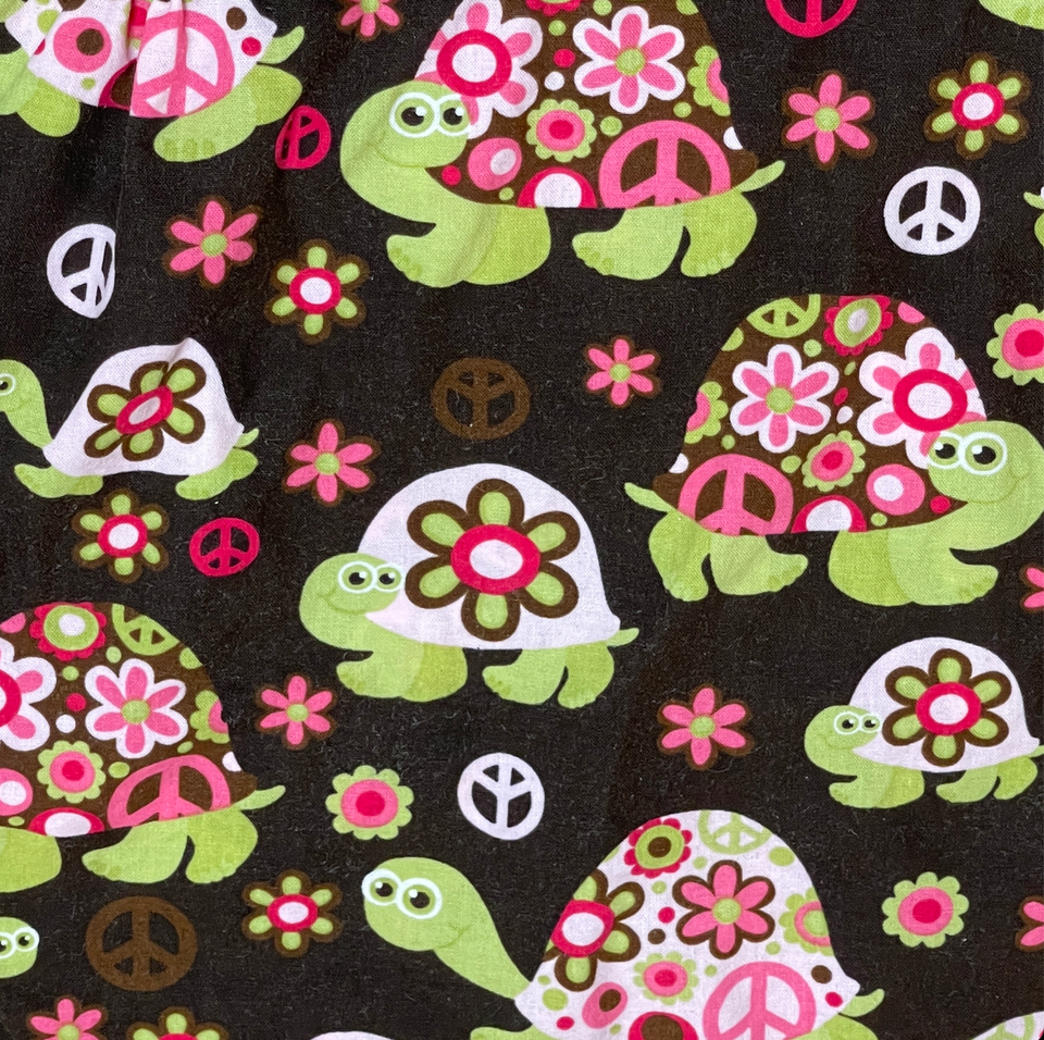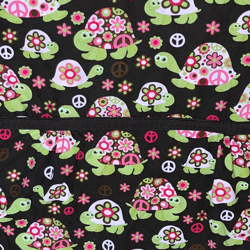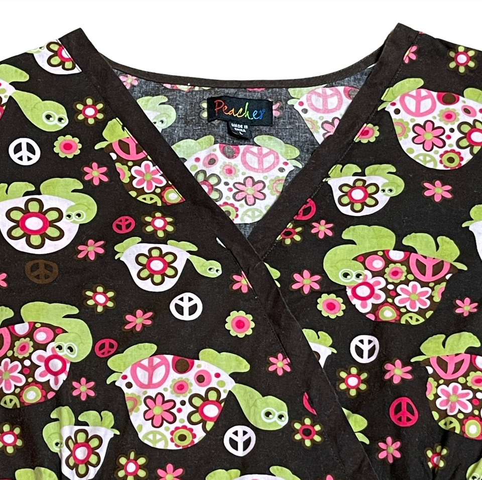 Peaches Brown Pink Turtle Floral Peace Sign Hippie Size Medium Scrub Top Shirt added to cart.