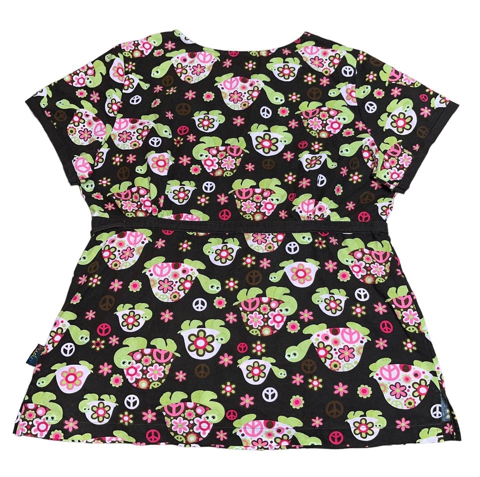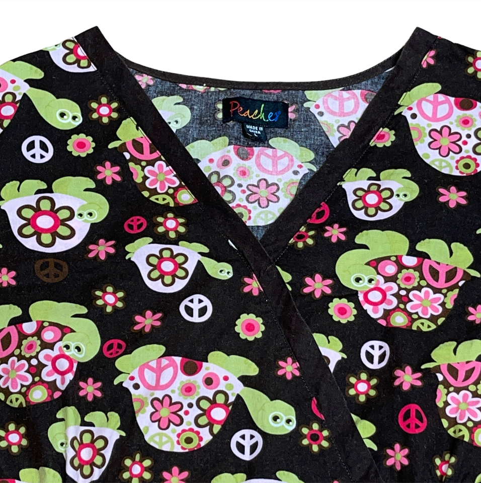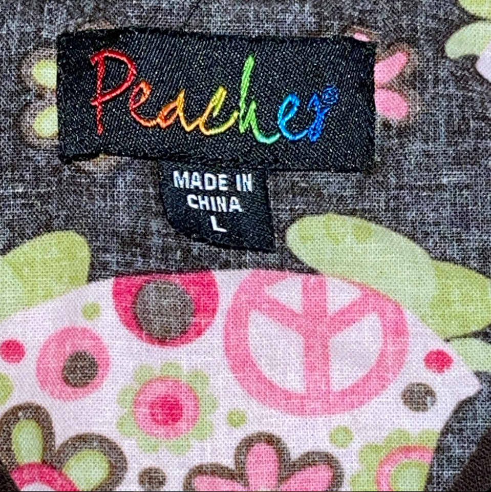 Peaches Brown Pink Turtle Floral Peace Sign Hippie Size Medium Scrub Top Shirt