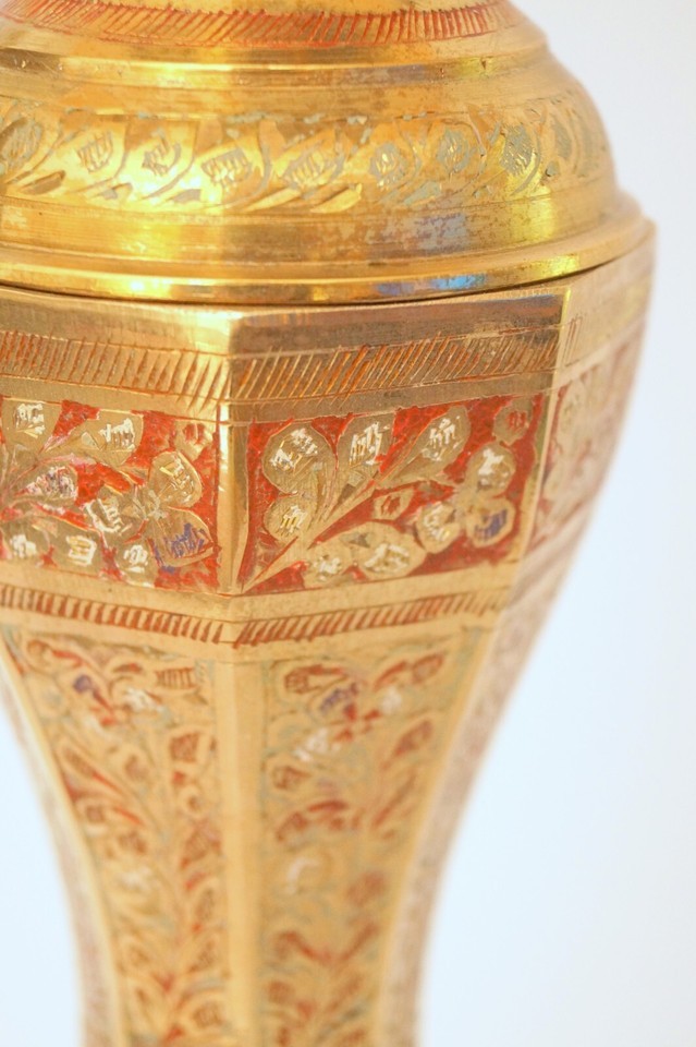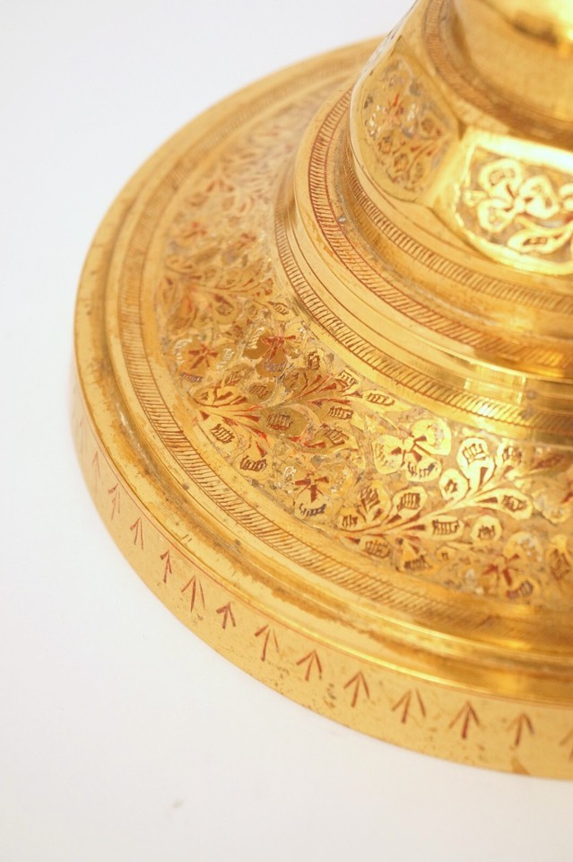 Brass gear with a beautiful, Indian marigold pattern, subtle old-age and use signs.
