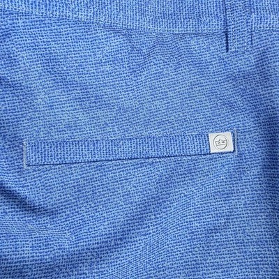 The Peter Millar Golf Shorts in men's size 35 are a stylish and comfortable option for both casual and travel occasions. Made from a lightweight and easy-care microfiber fabric blend of polyester and spandex, these mid-rise shorts feature a geometric blue crown pattern with subtle button and zipper accents. The 9-inch inseam and flat front design give a tailored and sporty look, perfect for a day out on the golf course during the summer, fall, or spring seasons. With a slash pocket and a brand known for quality, these shorts offer both style and functionality for the modern man.