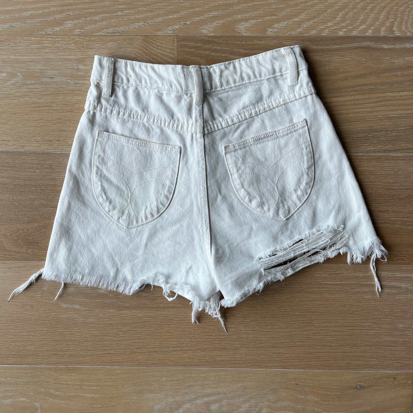 ROLLA'S High Rise Slim Dusters Denim Shorts in white. Intentionally destroyed detail. Zip fly with button closure. 5-pocket design. Frayed hem.