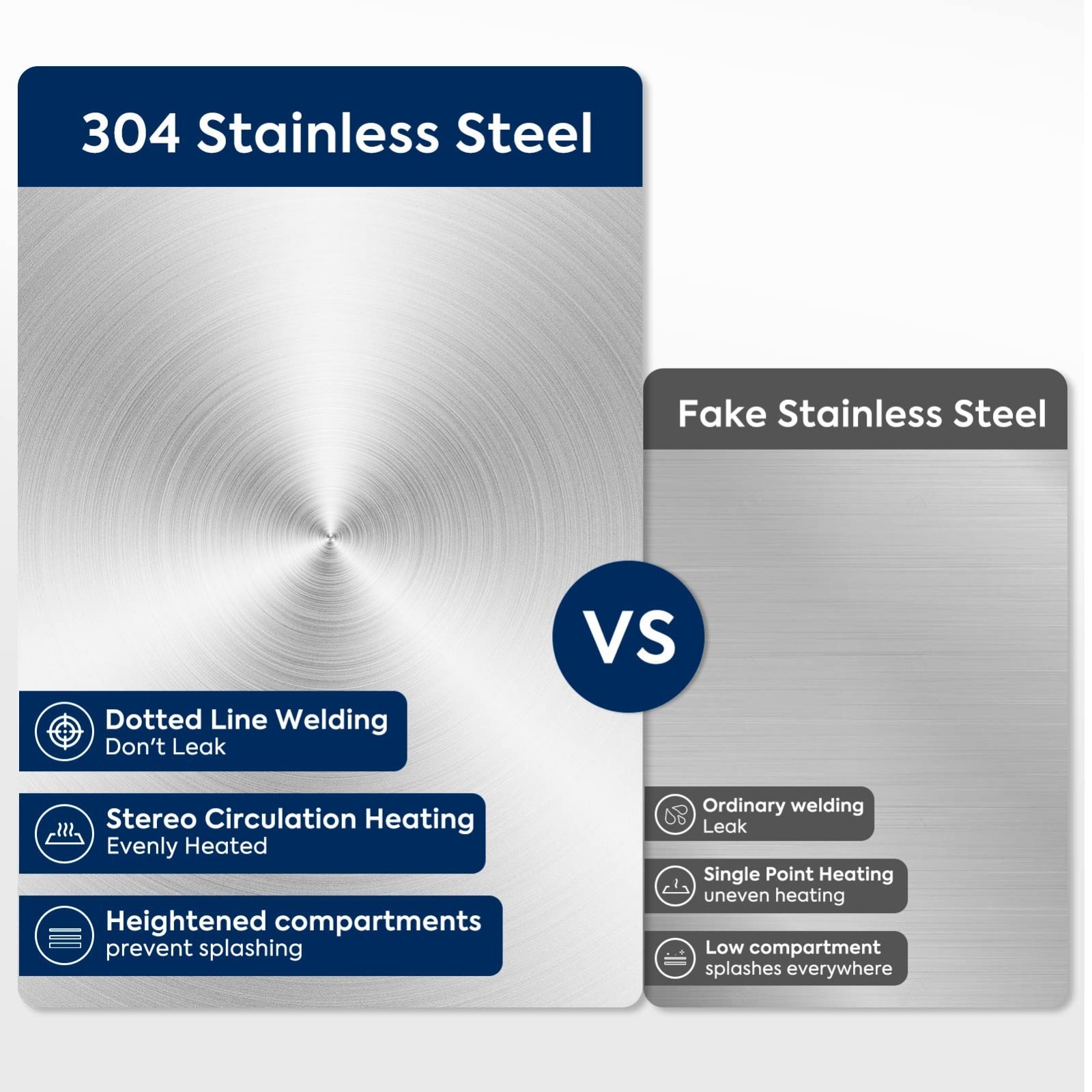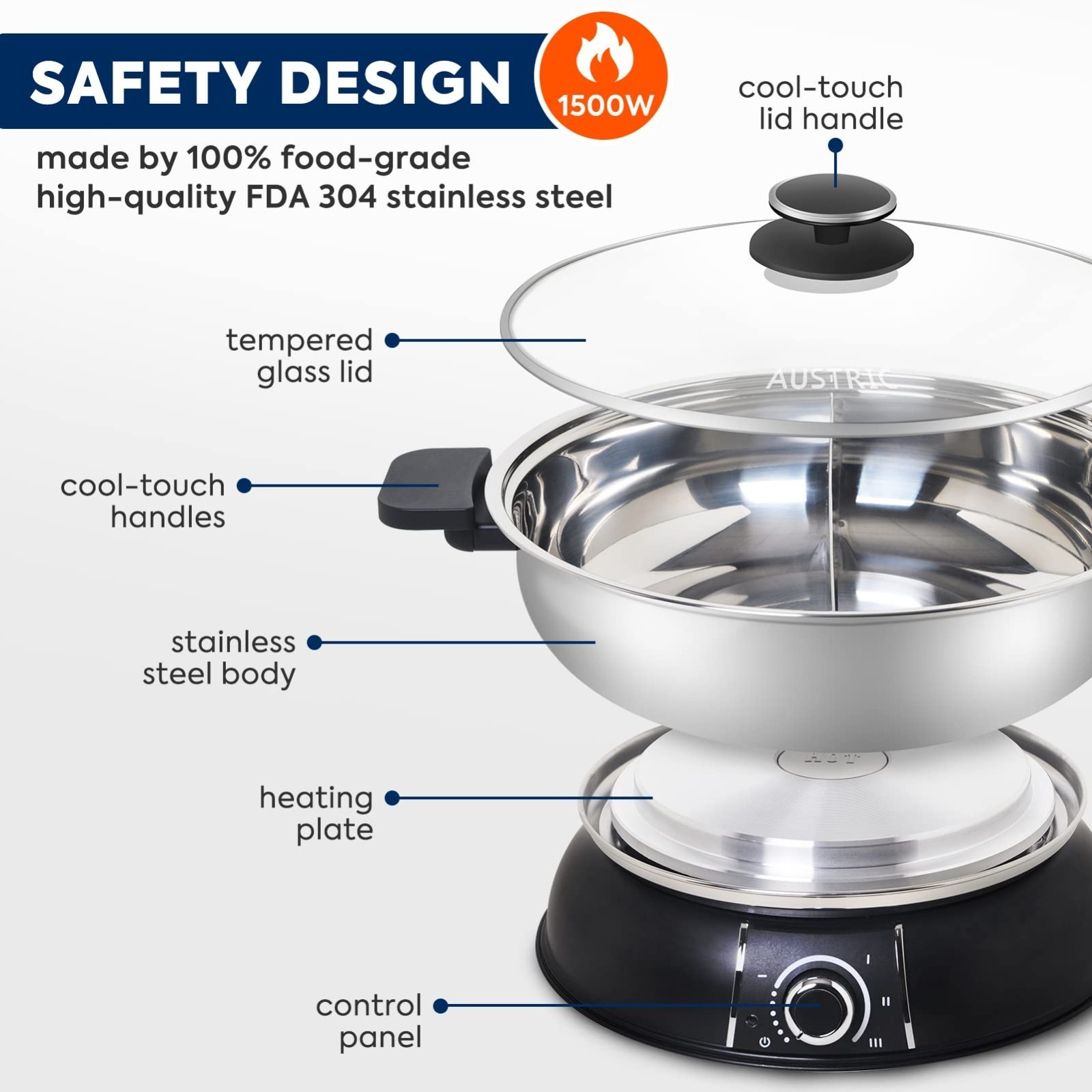 ?DUAL COMPARTMENTS ?Two Flavors at Once, Austric Electric Shabu Pot allows for two different types of soup to be cooked,S-shaped compartment to prevent overflow and prevent odor, With its integrated divider,it allows both to be heated and the double flavor hot pot prevents the fluid leakage effectively.