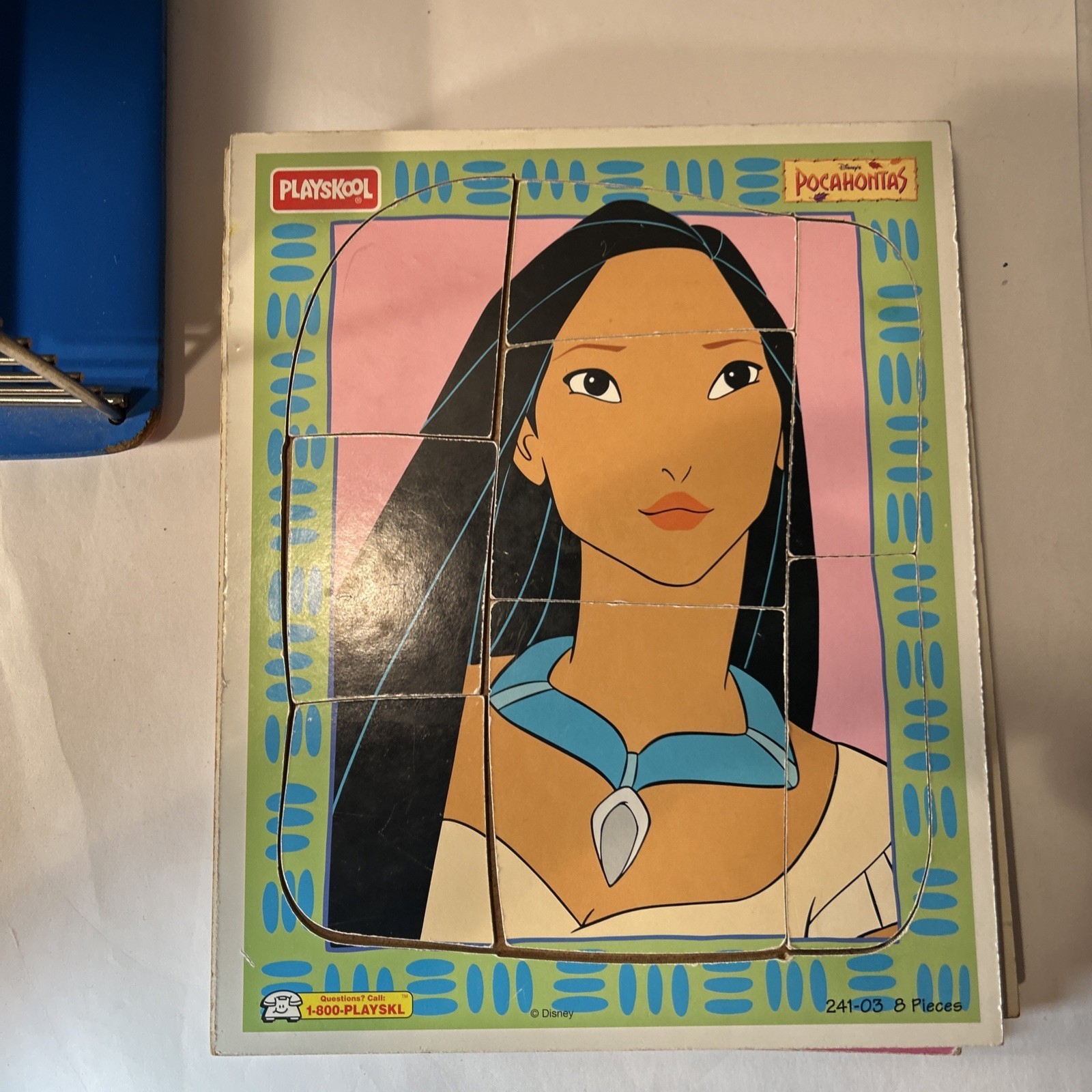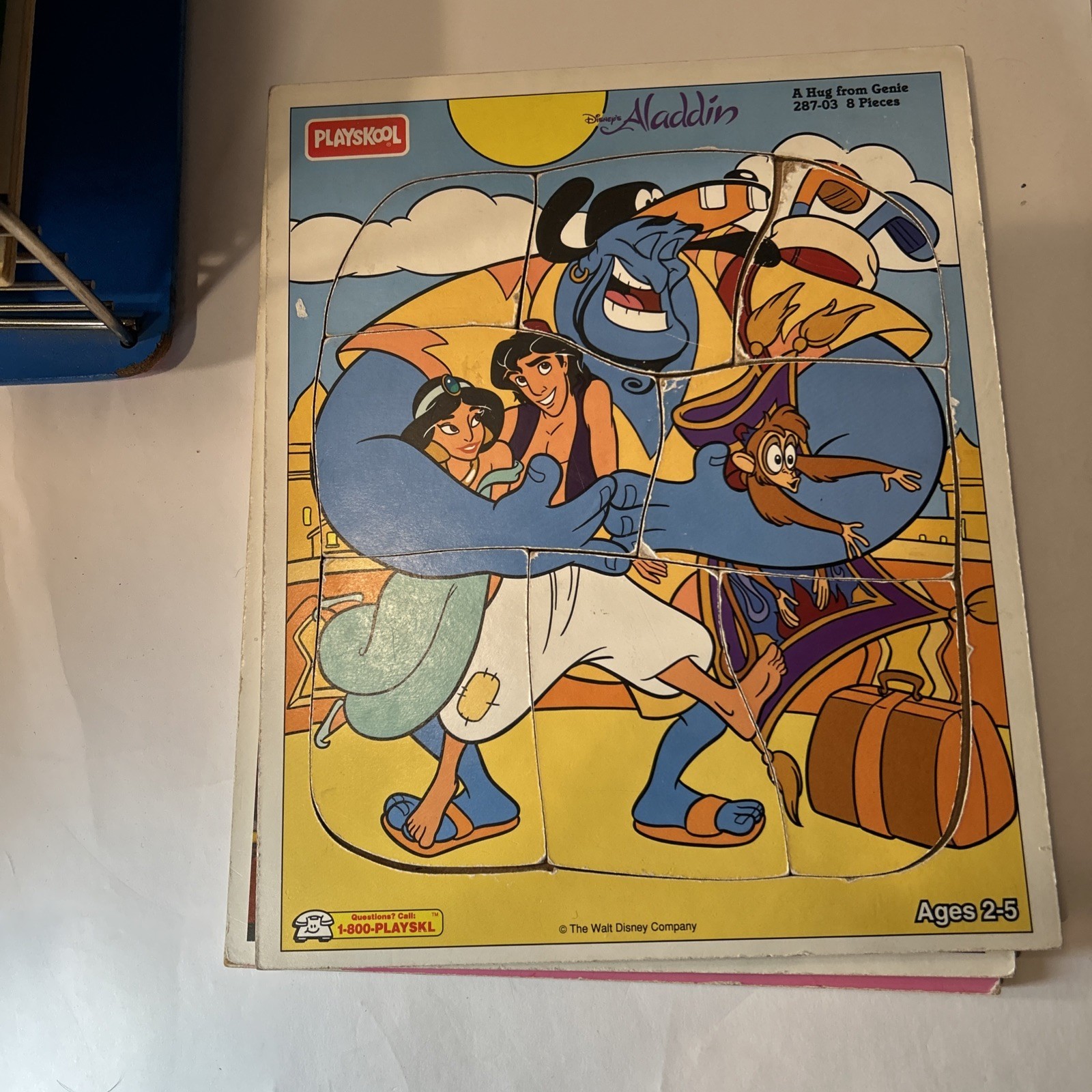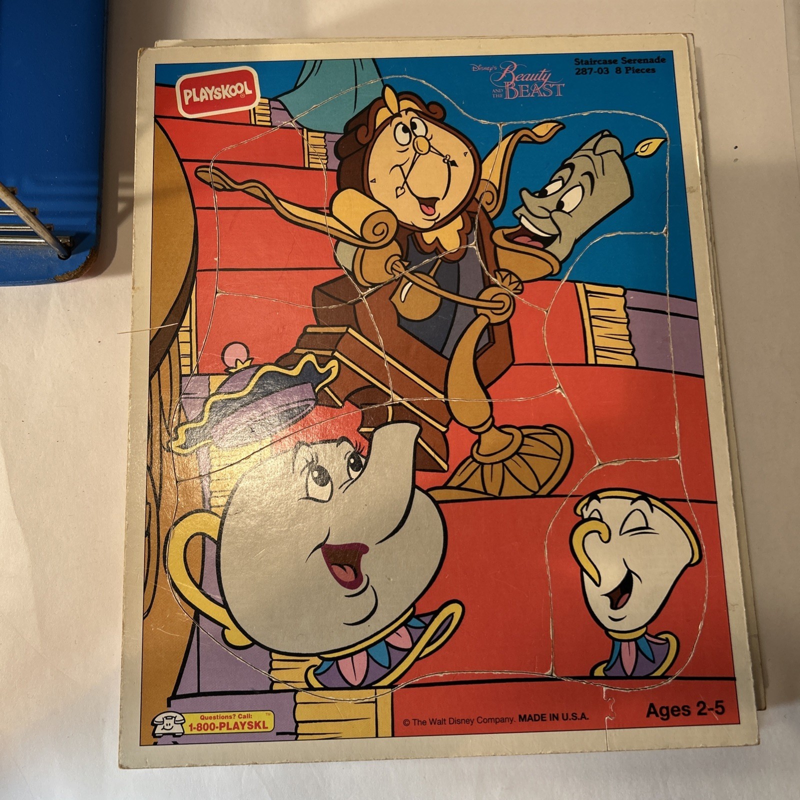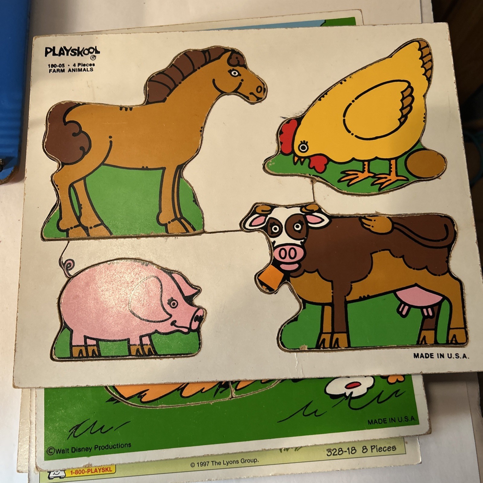 This vintage 1970s Playskool puzzle storage rack includes 12 classic wooden puzzles from brands like Playskool, Melissa Doug, and American Toys. From Mickey Mouse and Beauty and the Beast to farm animals and vegetables, this curated lot is full of nostalgic fun. All puzzles are complete and come neatly stored in a 12-slot blue metal/wood rack?ideal for collectors, classrooms, or gifting.