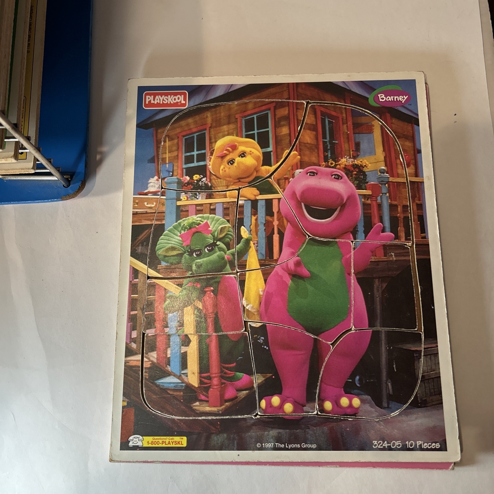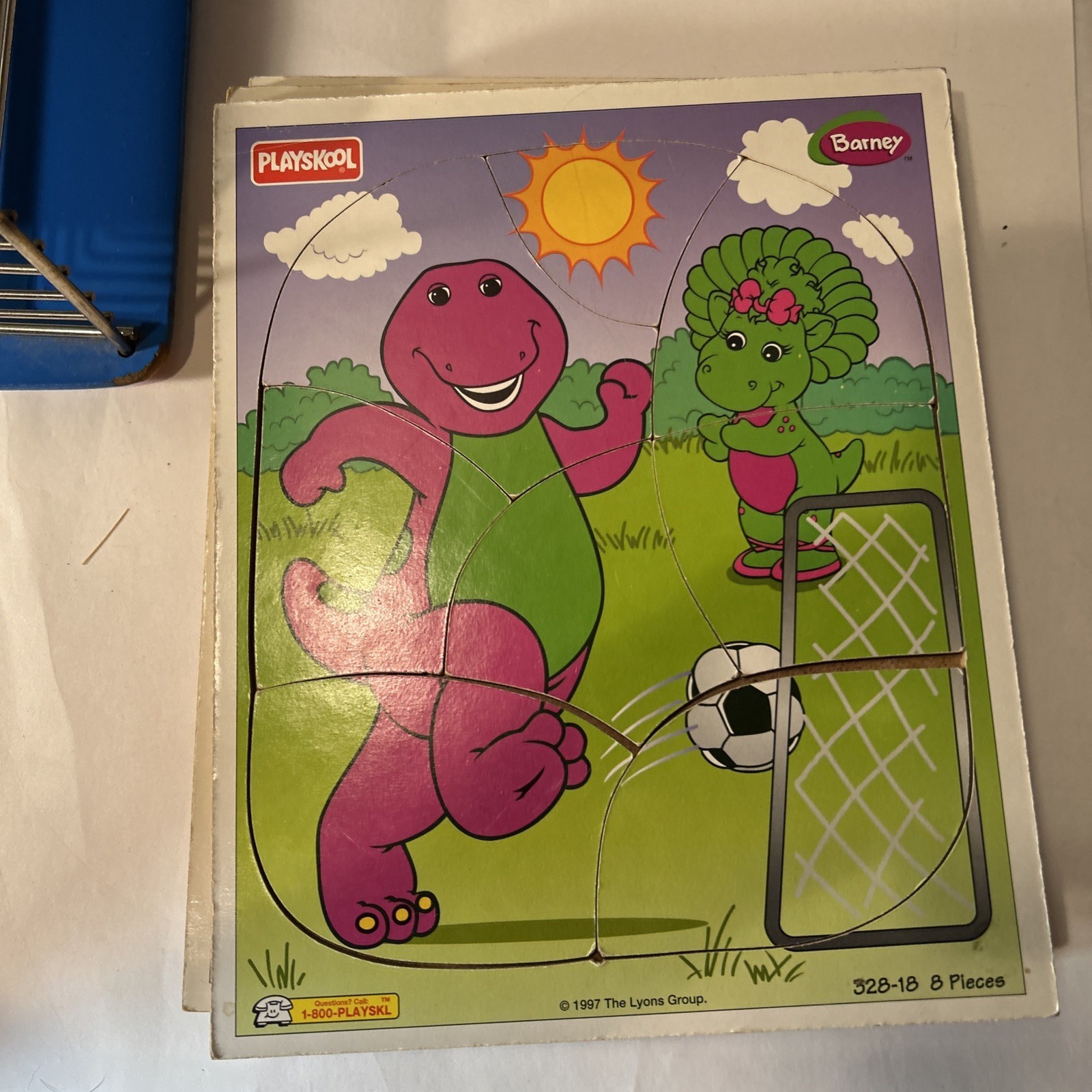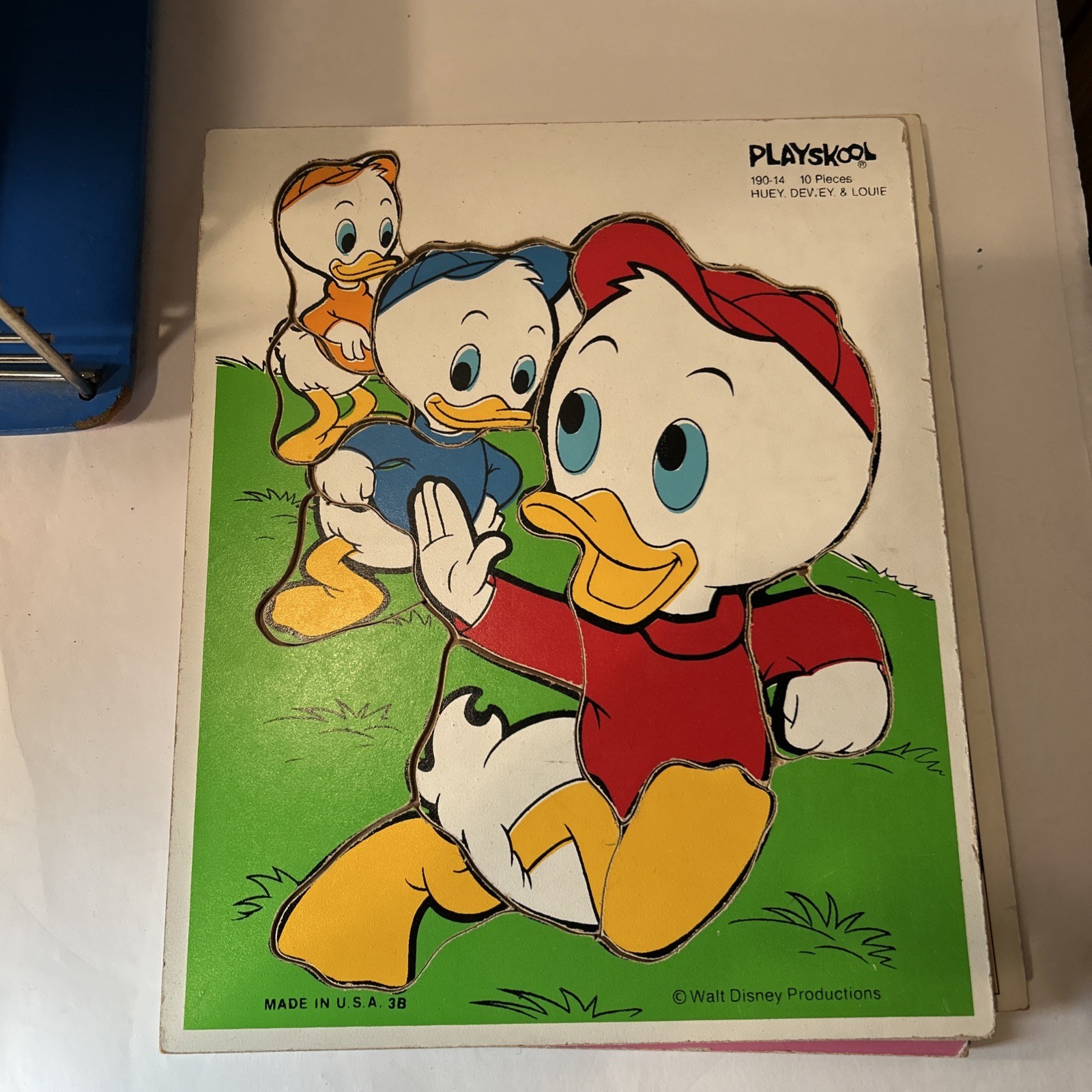 Vintage 70s Playskool Puzzle Rack w/ 12 Wooden Puzzles Disney Barney More