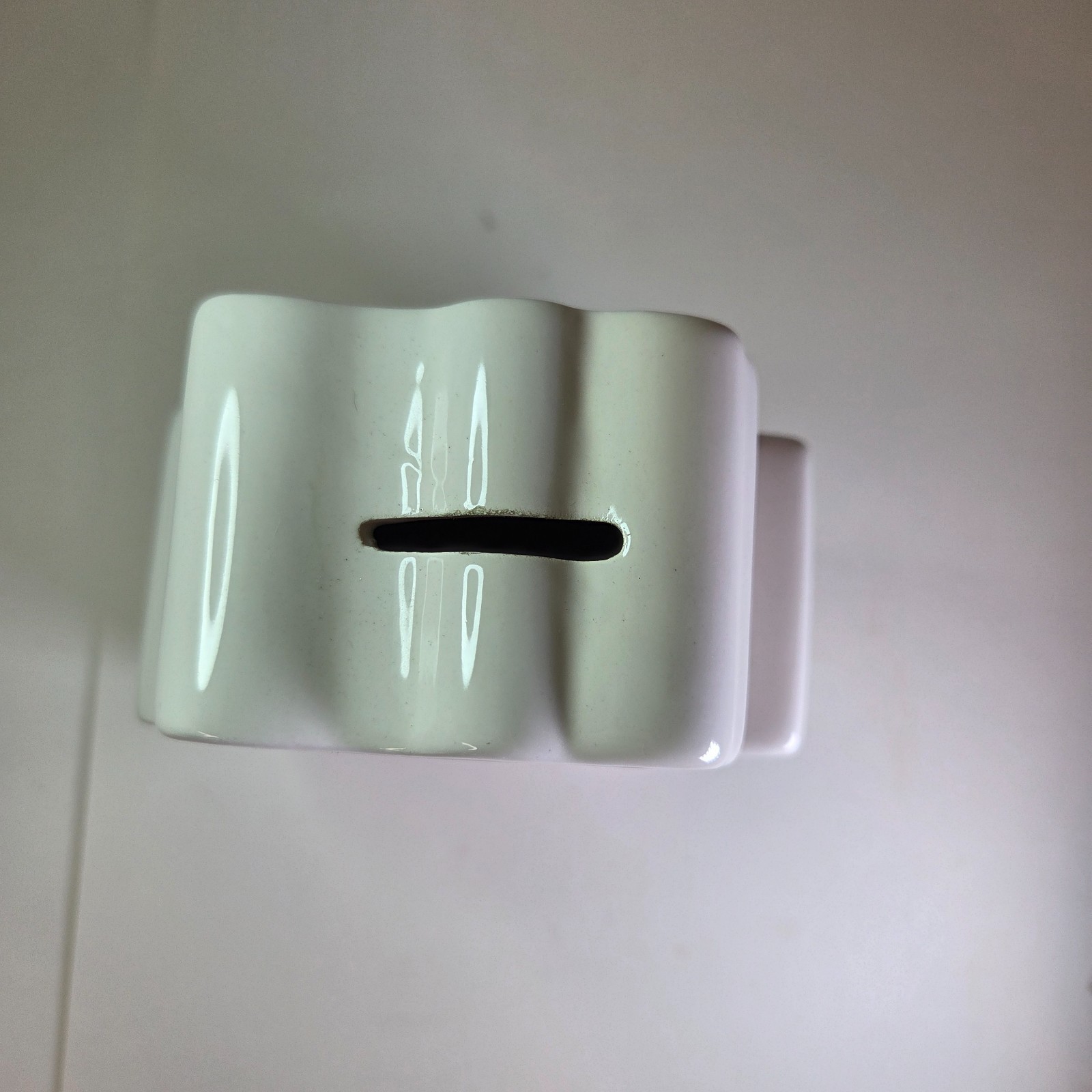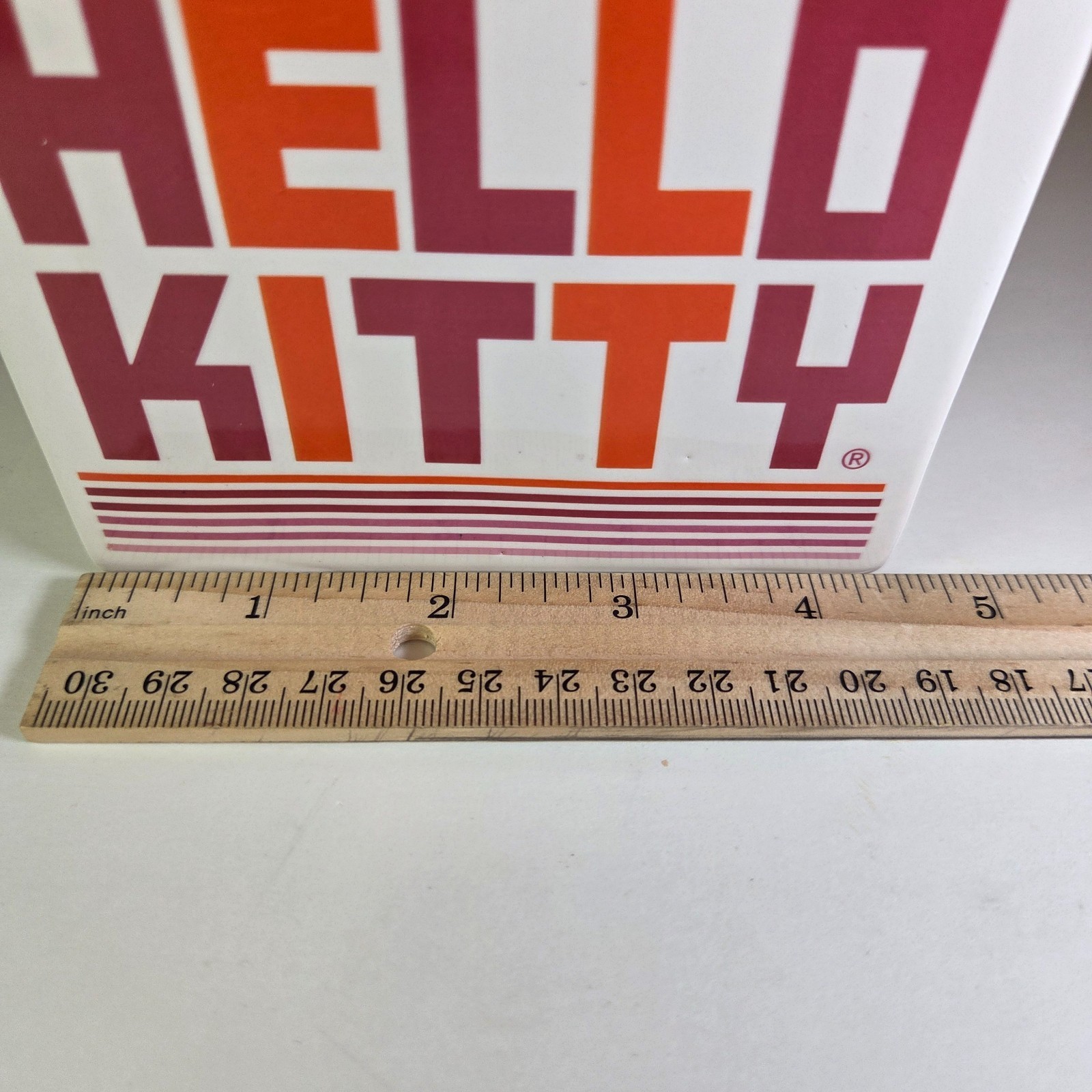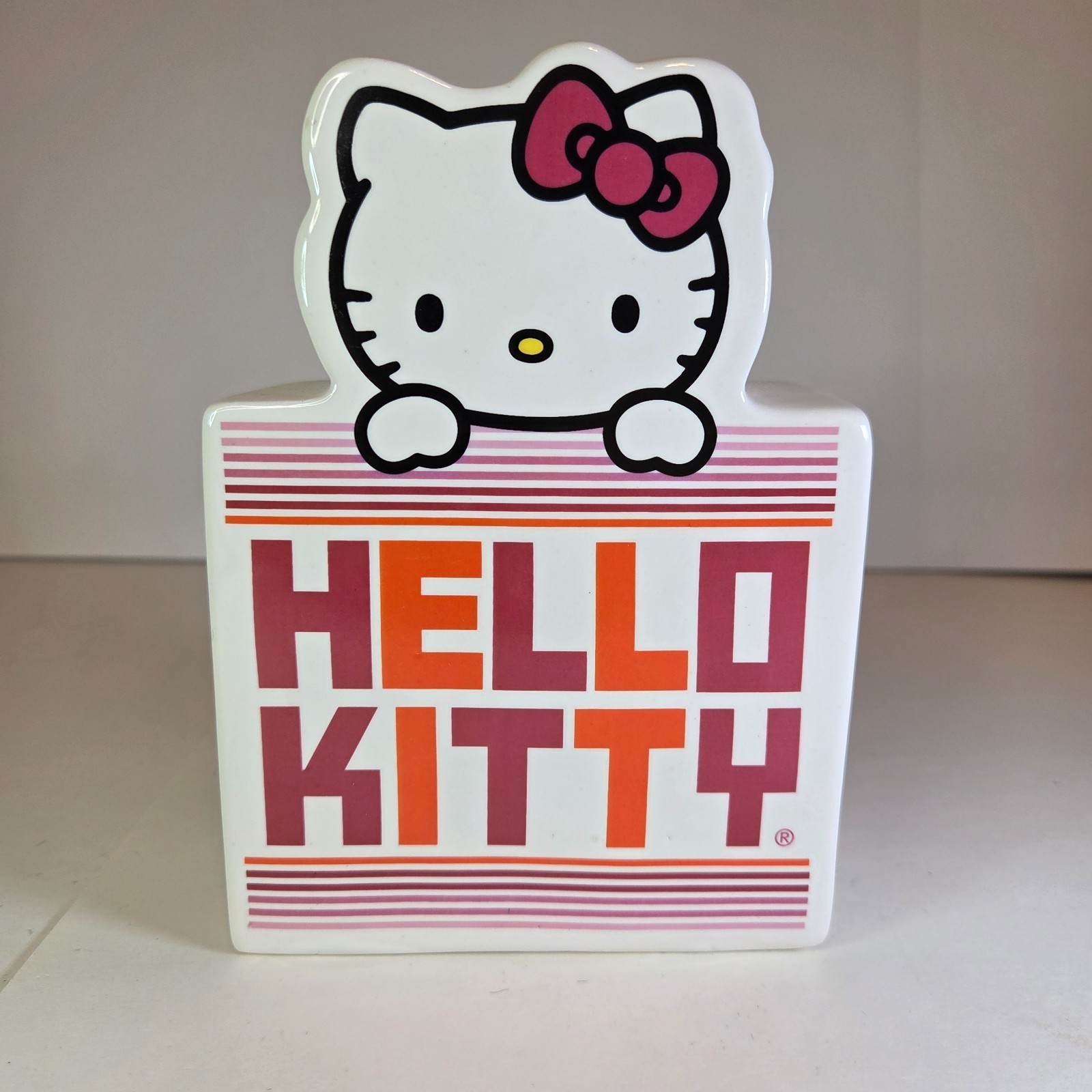This officially licensed Hello Kitty ceramic coin bank by Sanrio features a fun, retro block letter design in pink and orange with Hello Kitty peeking over the top. Dated 2012, this collectible piece is both functional and nostalgic?perfect for Hello Kitty fans or vintage decor lovers. Measures approx. 6.5" tall and has a bottom plug for easy coin removal.