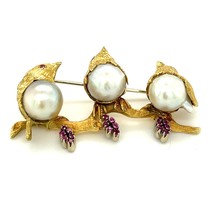 18k Yellow Gold Cultured Pearl Three Birds Sitting Brooch with Rubies
