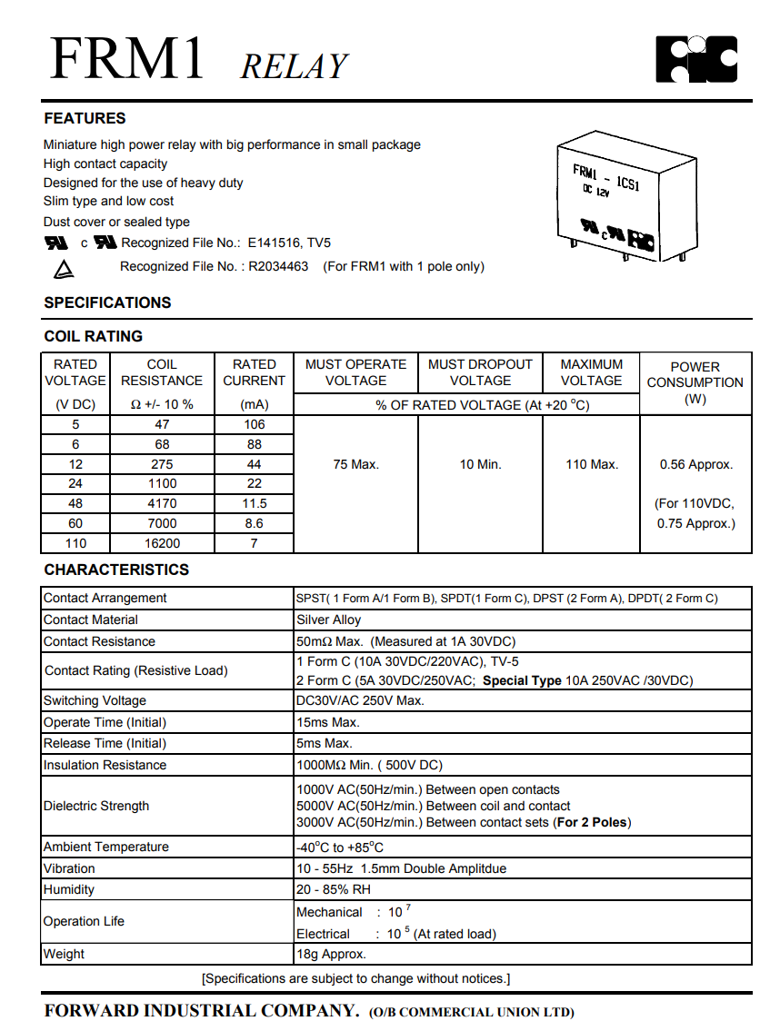 1 Piece - FRM1-1C-1 24VDC FIC PCB Power Relay 24VDC SPDT 10A 220VAC/30VDC TV-5 5-Pin