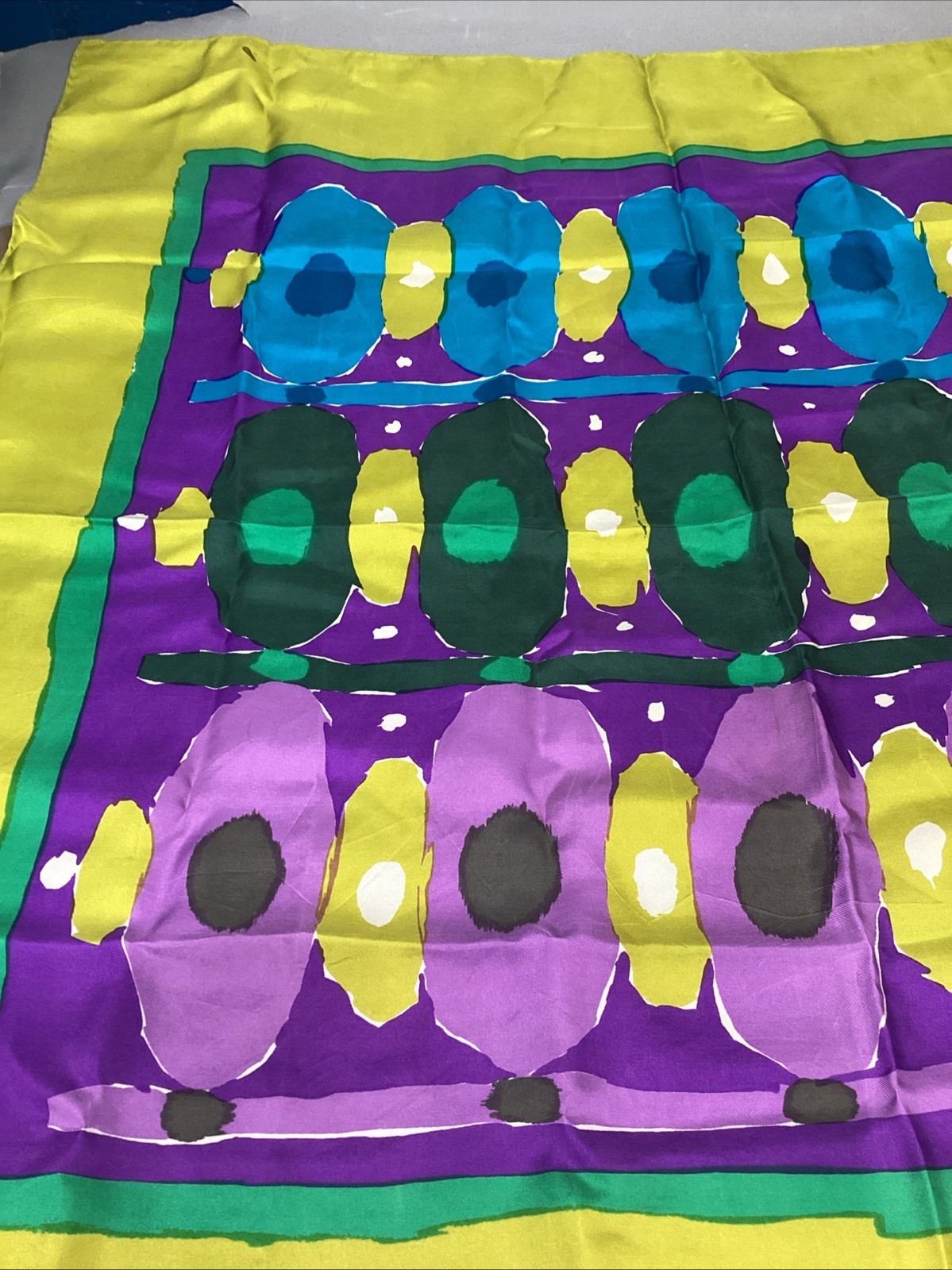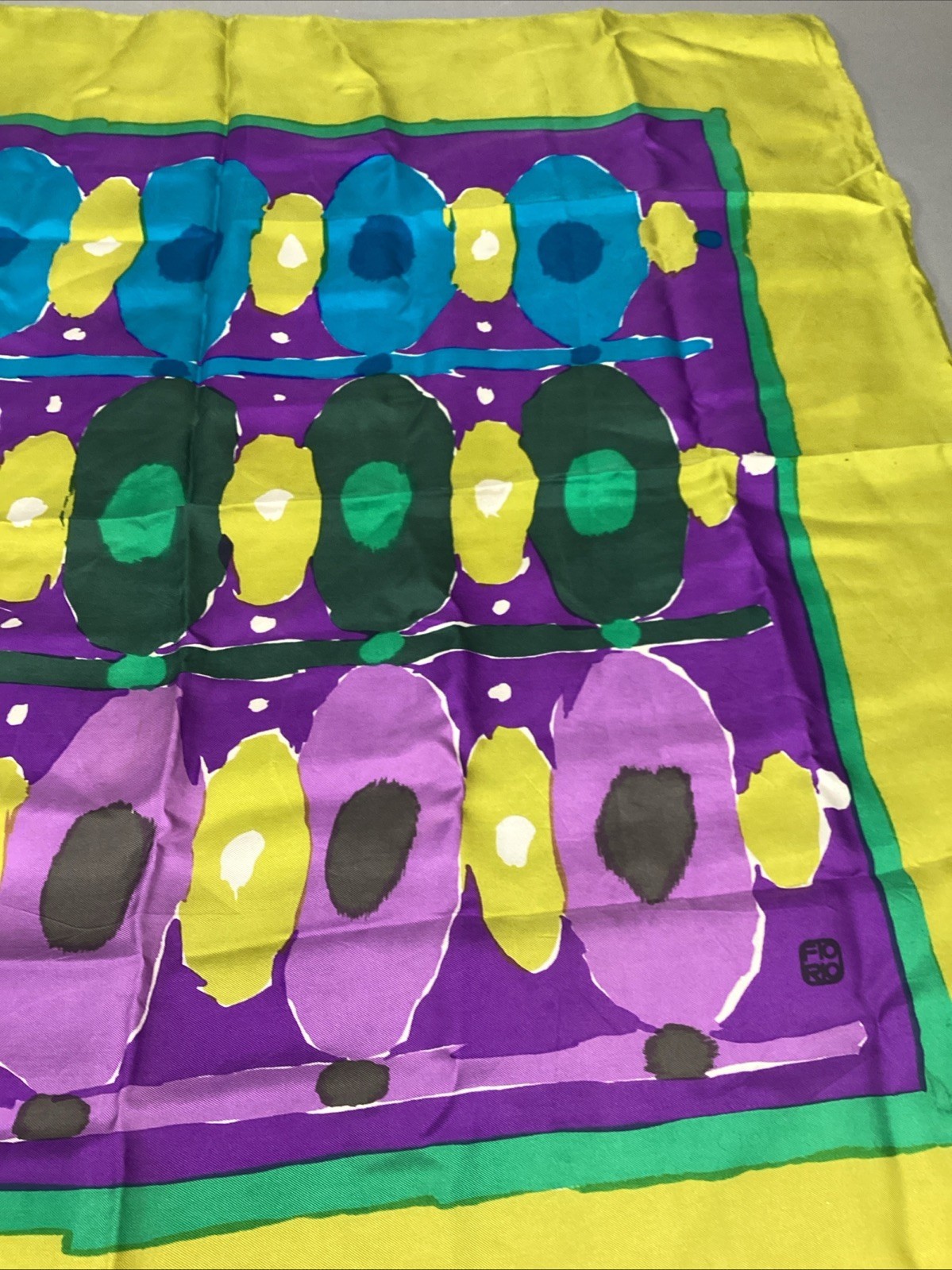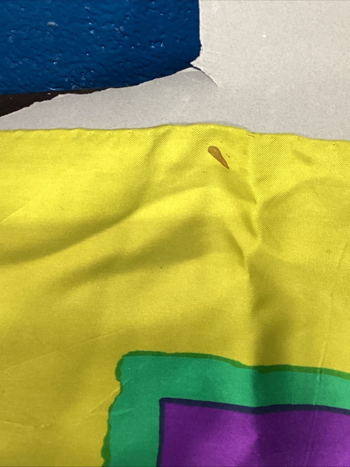Florio 100% Silk Multicolored Silk Scarf - 30x30?. In used condition. It has a few stains on the yellow border but the rest of the scarf looks good.