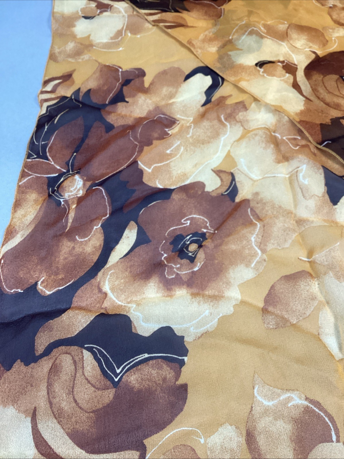 100% Silk Yellow Sheer Floral Scarf - 60x15?. In good, used condition. I. It iced 1 small stain in the scarf which is visible on both sides.