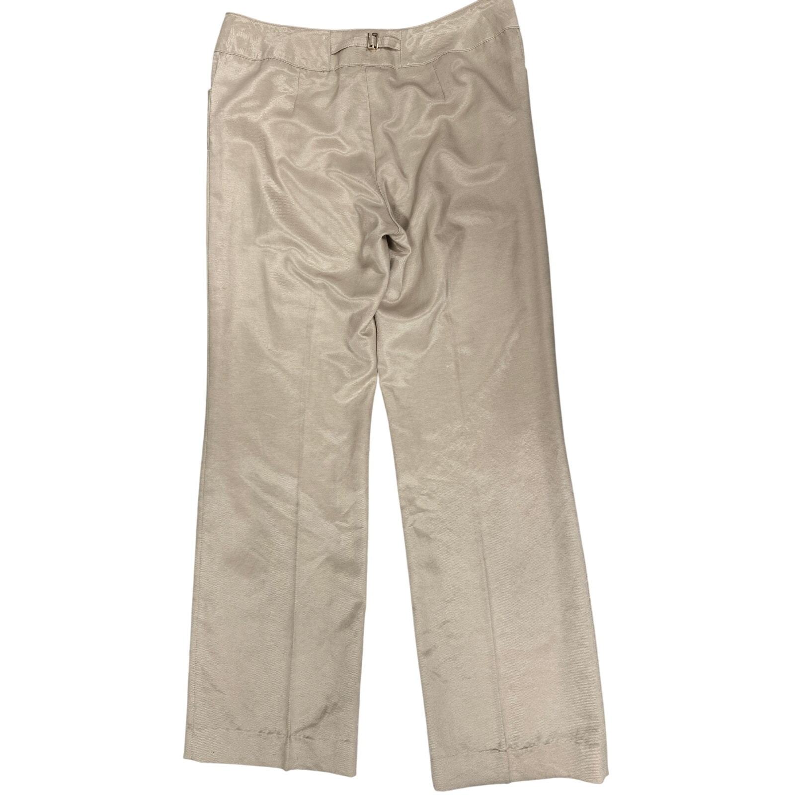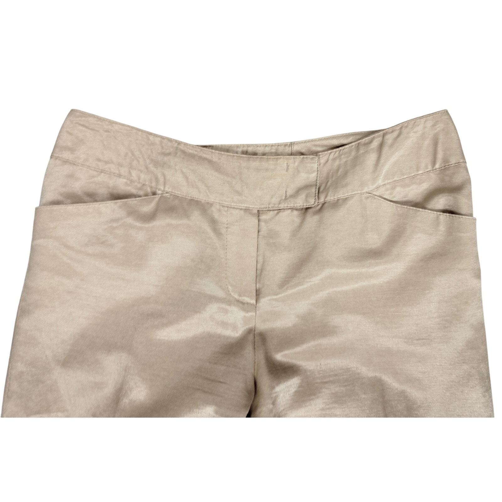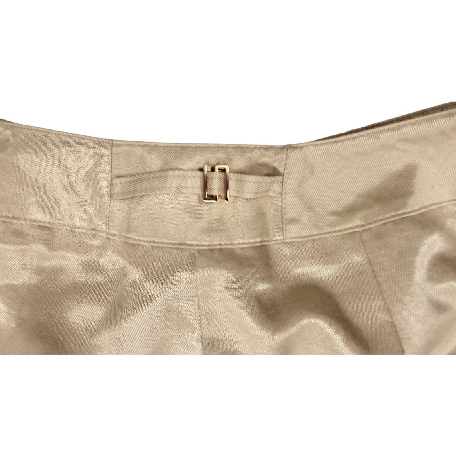 Fabric content not stated ? likely a synthetic/poly-blend with a satin finish. Champagne-beige with sheen. Features buckle-back waist adjuster.