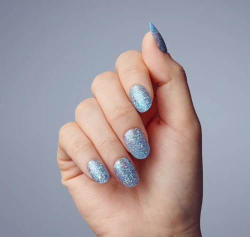 Blue fashion nails are short length oval shaped