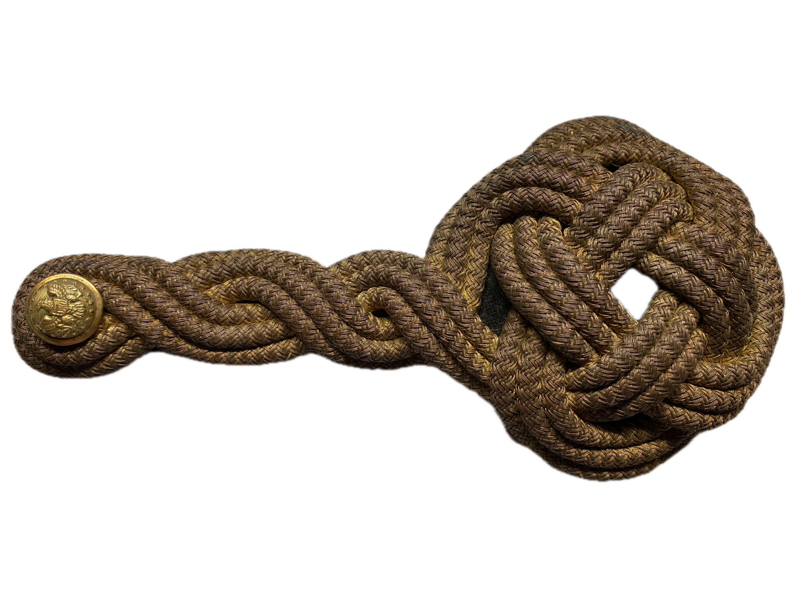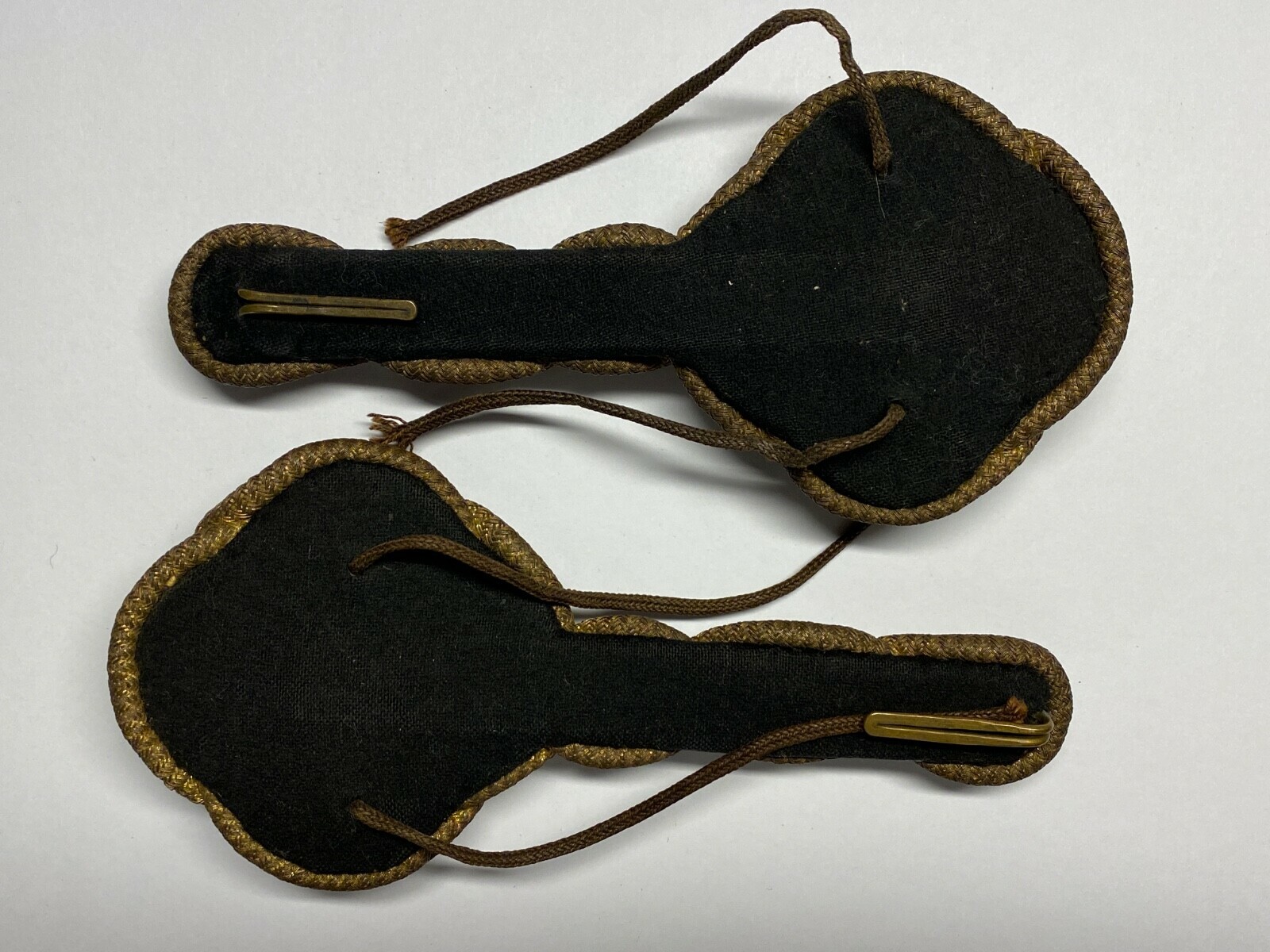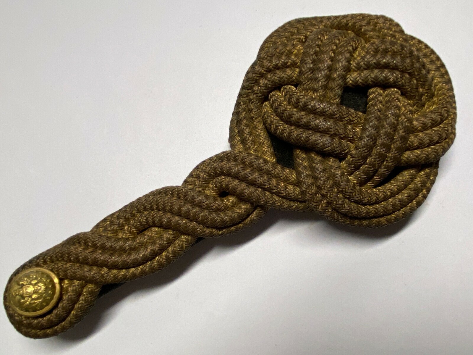 This set of Pattern 1885 NCO Shoulder Knots, has survived as an intact set, and shows little, if any, evidence of having been issued or used. Both shoulder knots are full form, have the complete lining on the underside, and original general staff service buttons are in place, the brass mounting hooks are present, and the full length ties are intact. The gilt Russian braid knots display patina due to age.