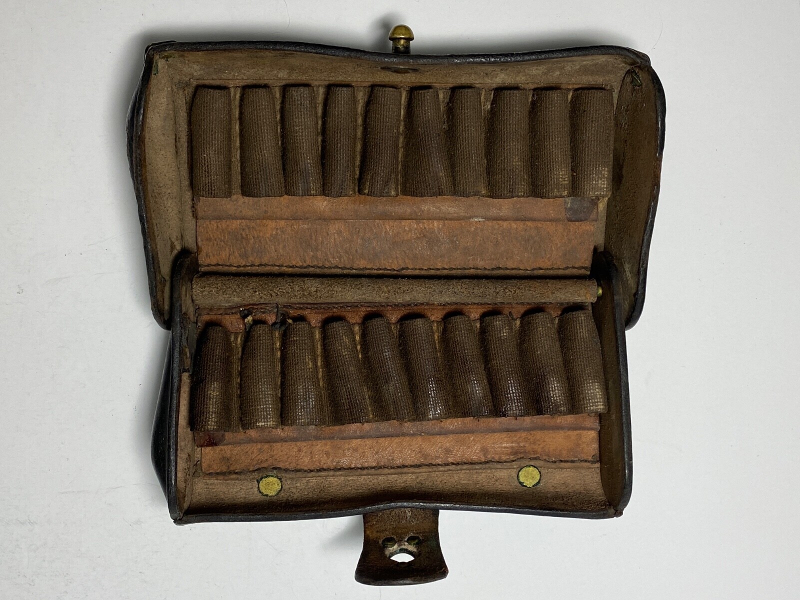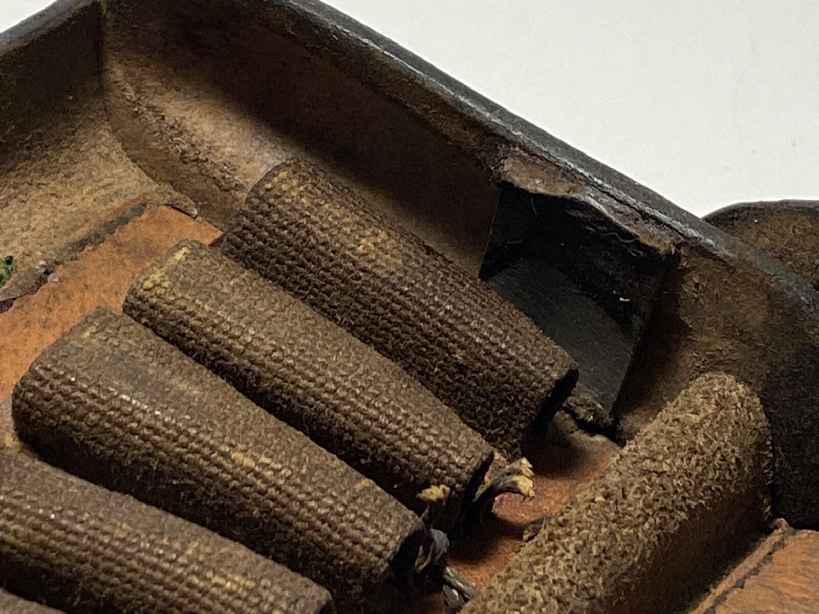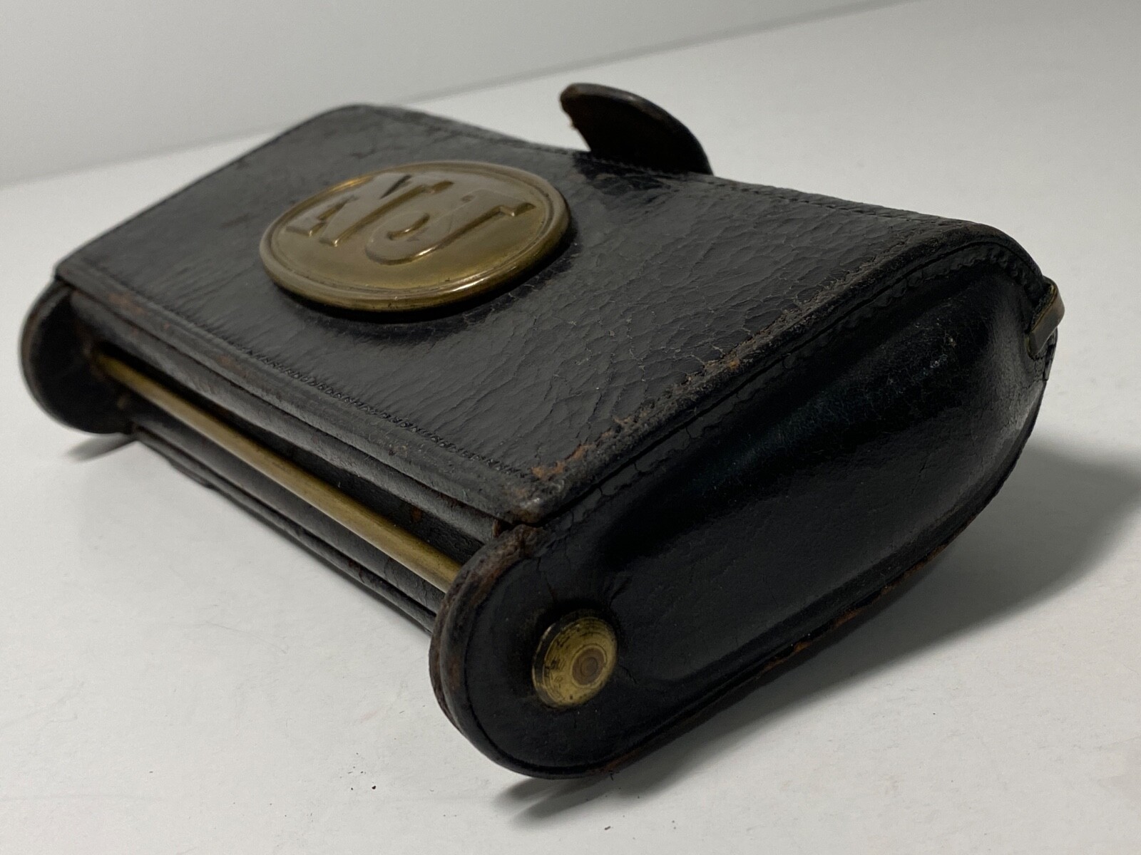 Made by the Watervliet Arsenal, this original item is the 2nd pattern style and was designed to hold cartridges for the US M1873 Trapdoor Rifle chambered in .45-70 Government. This is the second pattern box, indicated by the presence of the brass corner staples and tab escutcheon. This pattern would remain in use throughout the Indian Wars period and Spanish American War. The box remains in good to very good condition, showing signs of age, use, and wear. The leather shows crazing and drying, and flaking of the finish from age. Webbing is all intact and hardware has just a hint of verdigris. Has the soft canvas cartridge loops and bellows. The 20 interior canvas cartridge pockets are in nice condition. They are soft and pliable and not stiff or torn and not stretched out. Markings; Watervliet Arsenal on closure tab. There is the storage compartment for the take-down tool on the right side. Workers at the Watervliet Arsenal demonstrated the ease of producing a bulge in the side of the box to create a pocket for the rifle tool and added a piece of material on the inside to secure it. Brass New Jersey National Guard Box Plate is secure. Produced at the Watervliet Arsenal in West Troy, NY. Overall, a very nice box.