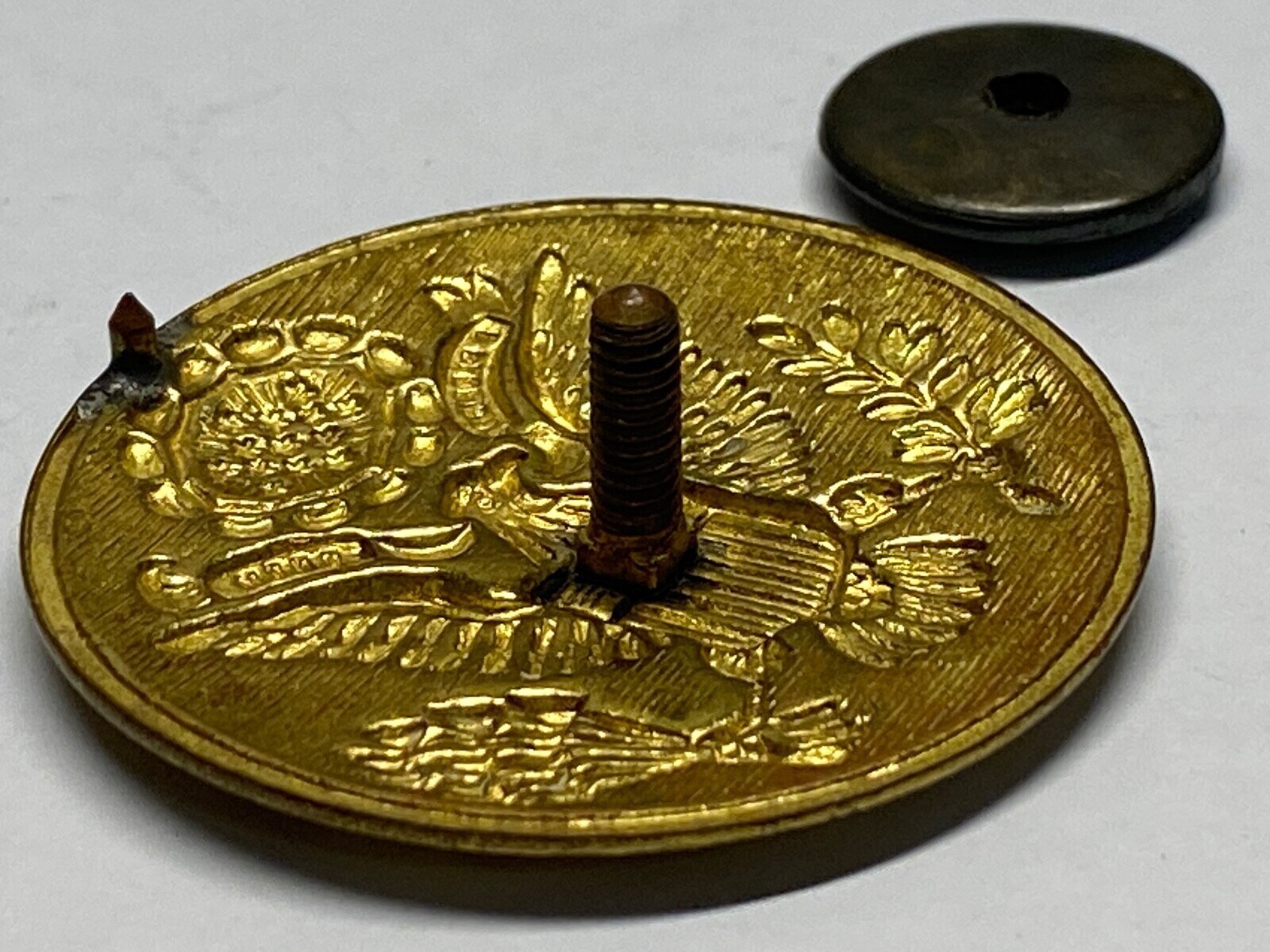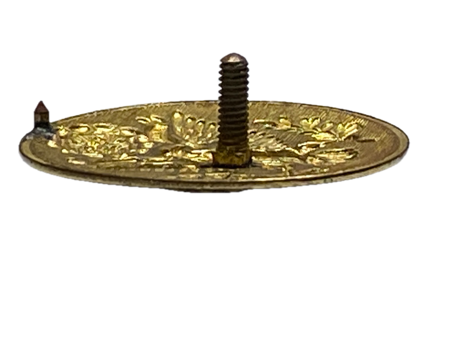This cap insignia is die stamped from brass and then gold plated. The reverse of this badge is concave rather than flat. This has a small sharp ended pin soldiered to the edge of its reverse to help keep the insignia from turning on the cap. A screw post is soldiered to the badge so that an attachment nut can be sued to fasten the insignia to the cap.