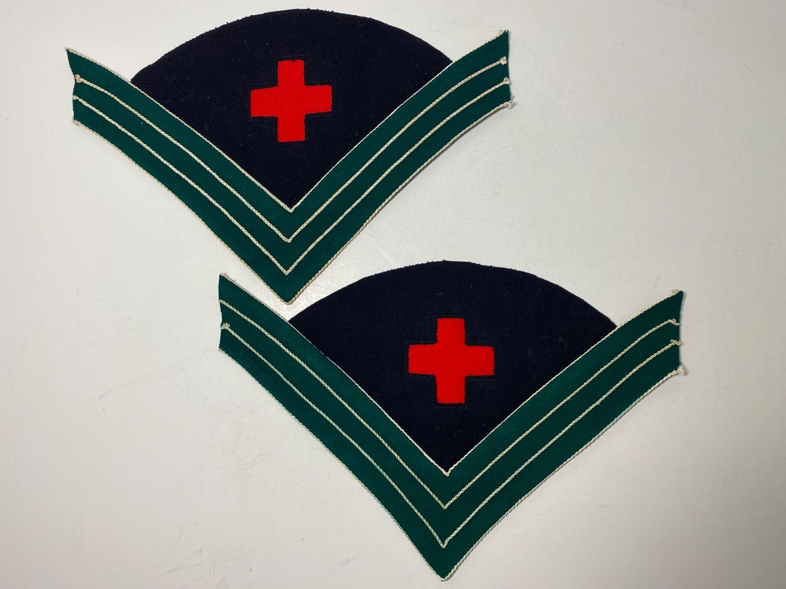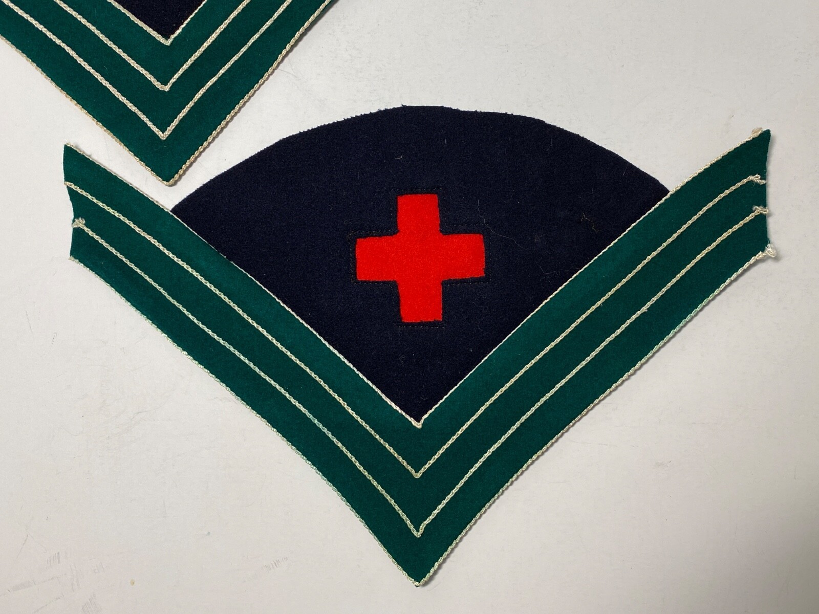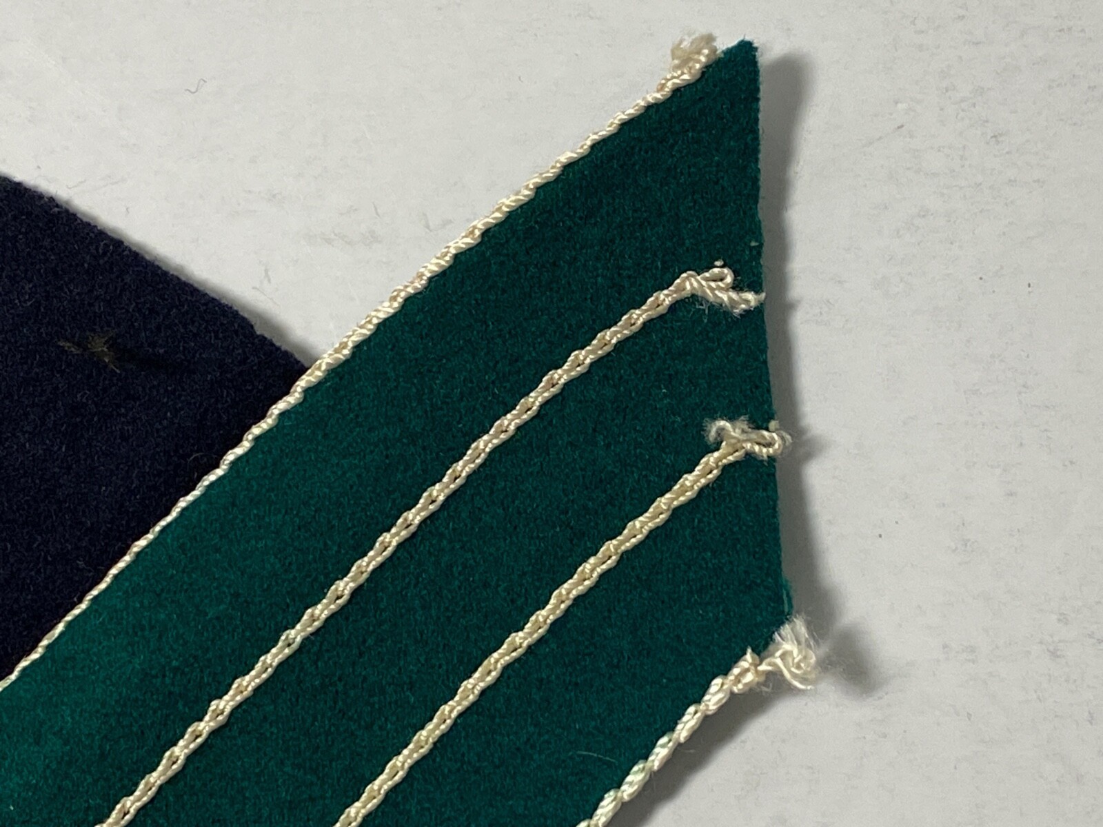 The chevrons are individual strips of green wool sewn onto a dark blue quarter inner circle, with a 2?x2?red wool cross within the center. A complete unissued, unused chevrons with no moth nips. White chain stitching.