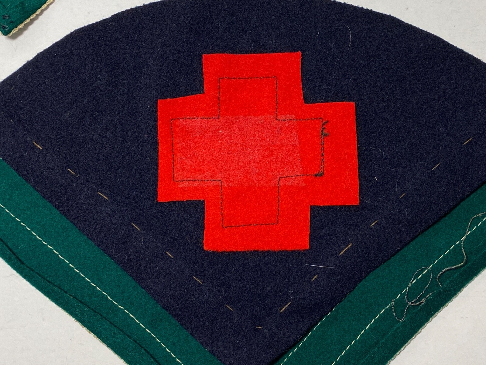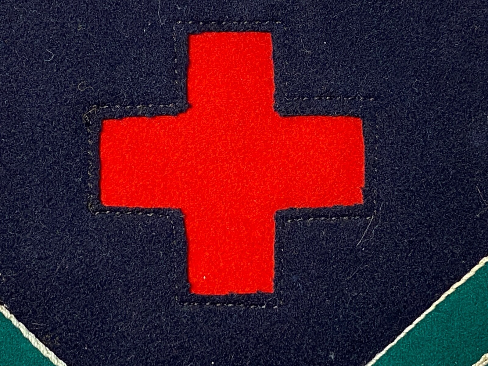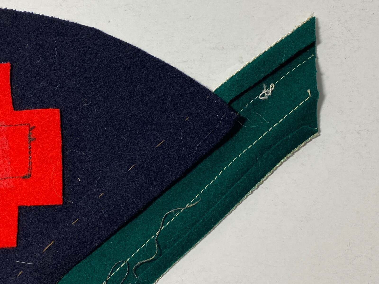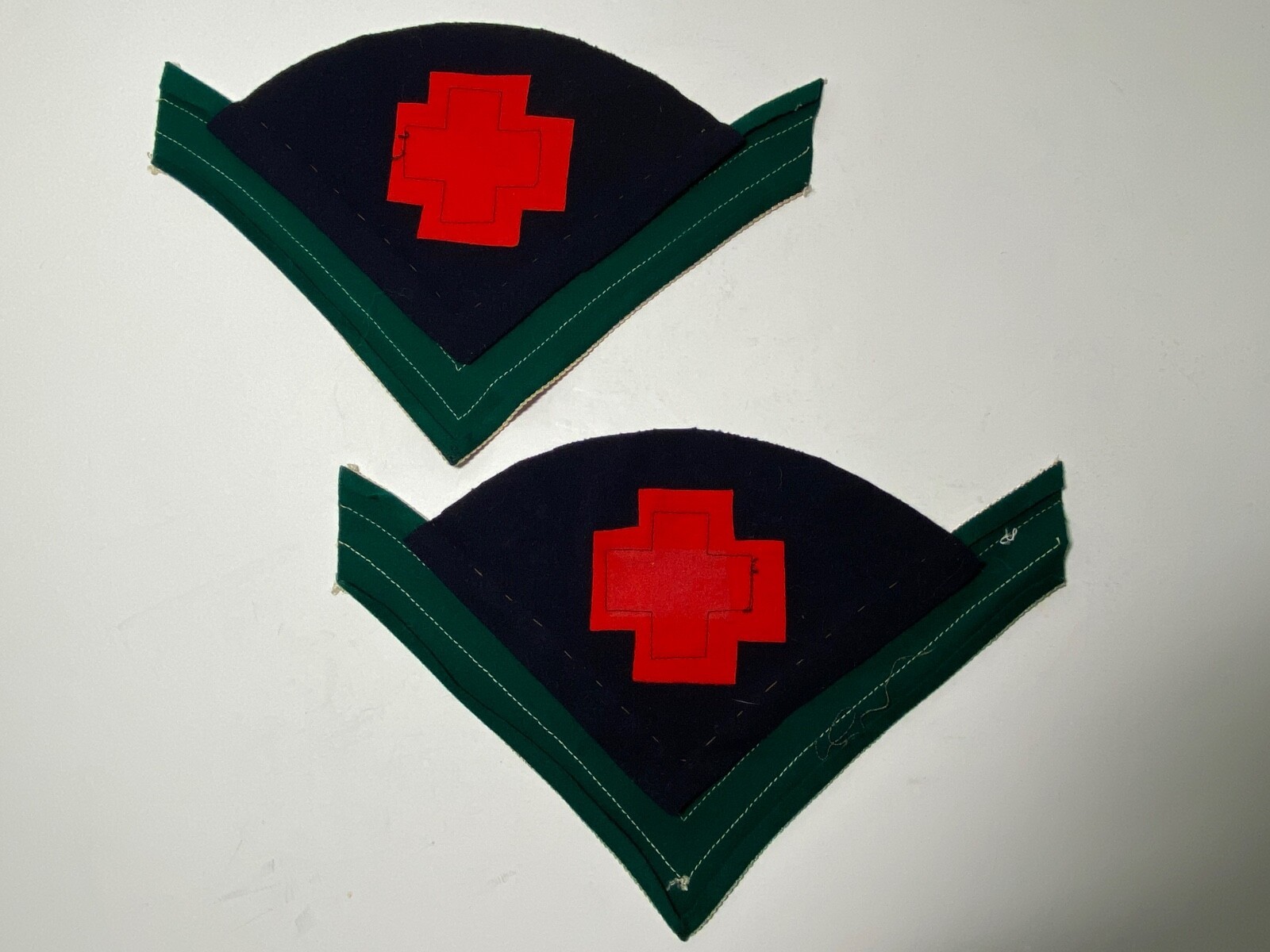 The chevrons are individual strips of green wool sewn onto a dark blue quarter inner circle, with a 2?x2?red wool cross within the center. A complete unissued, unused chevrons with no moth nips. White chain stitching.