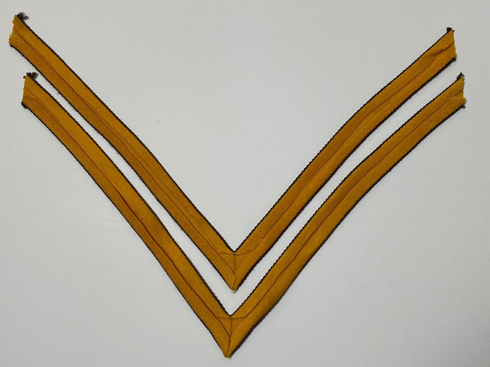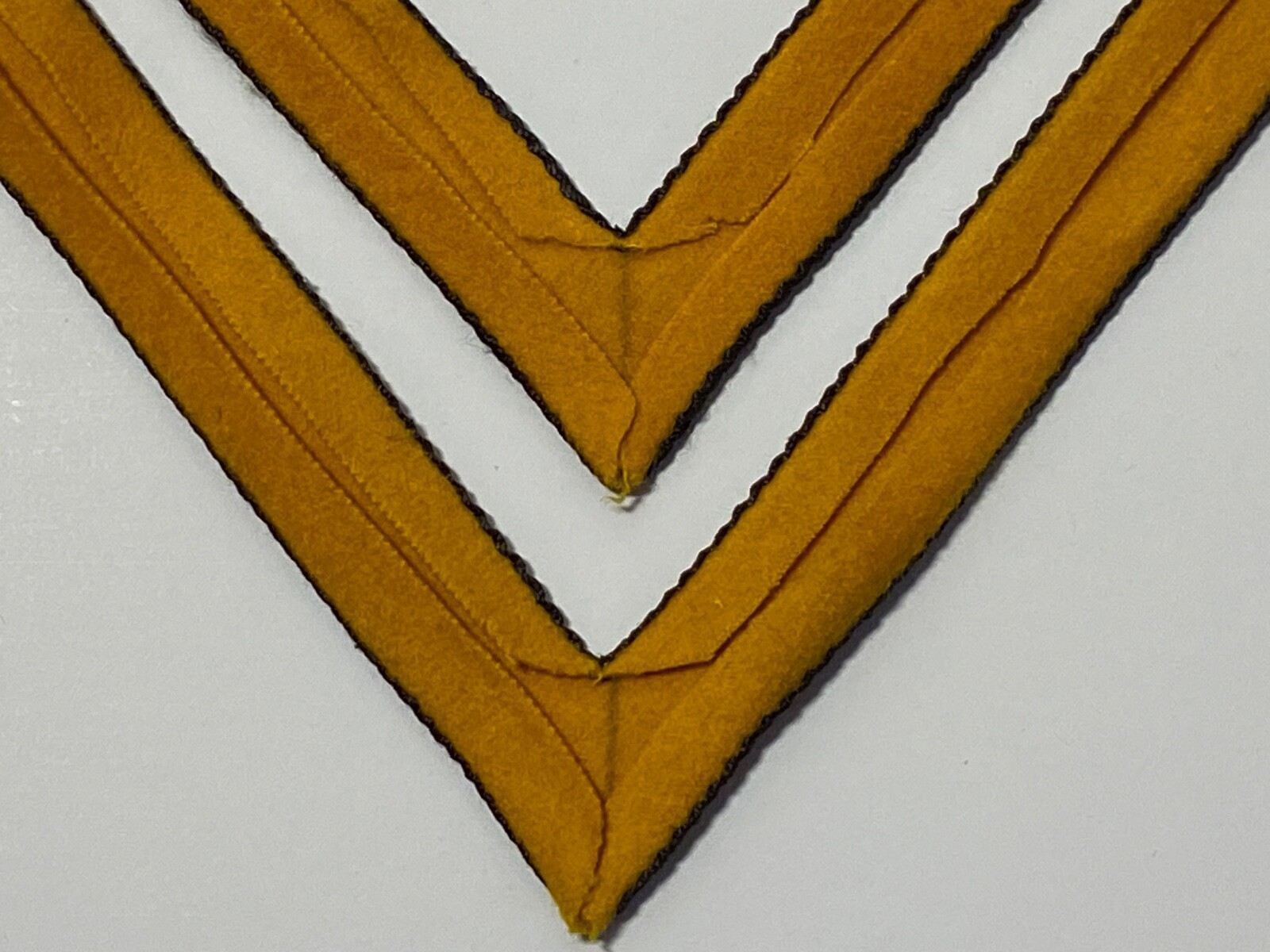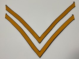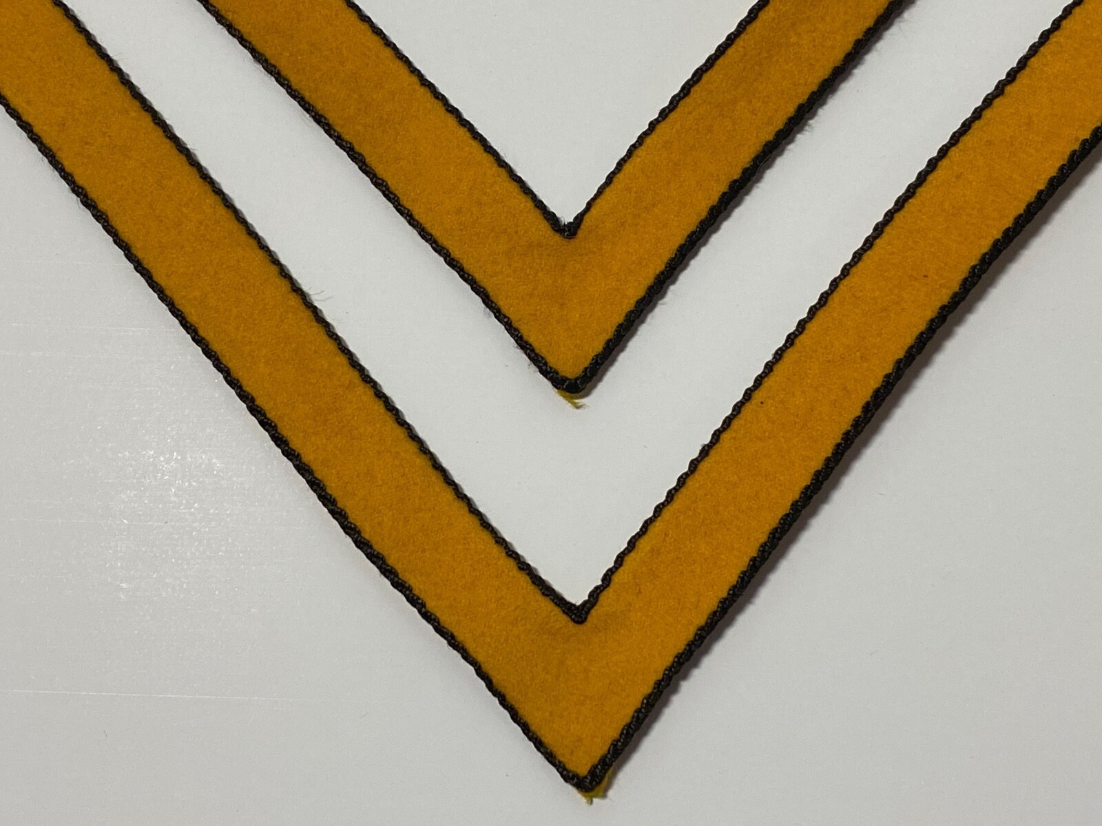 Yellow wool construction with black chain stitching along the borders. These appear to be unused. There is no evidence of use, age, and no moth damage. This matched set of chevrons were worn during the Spanish American War and Indian Wars. Matched set.