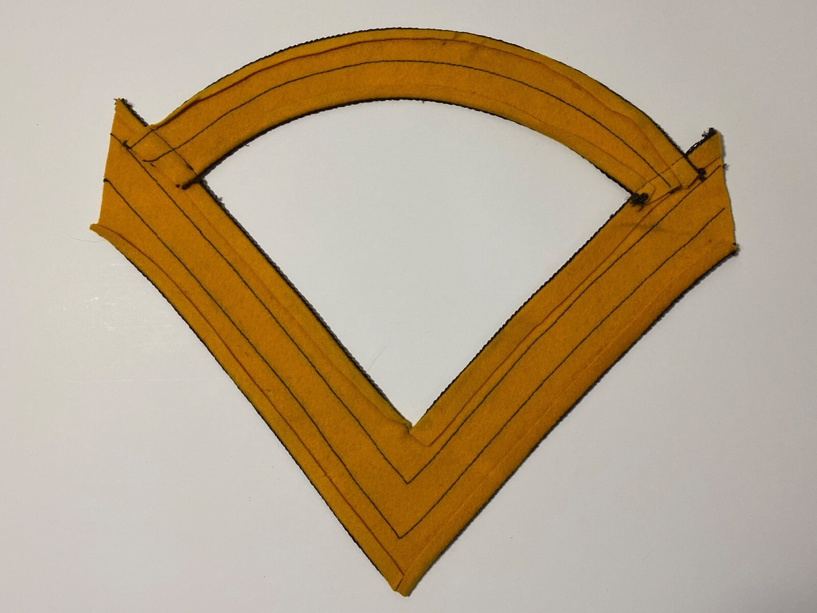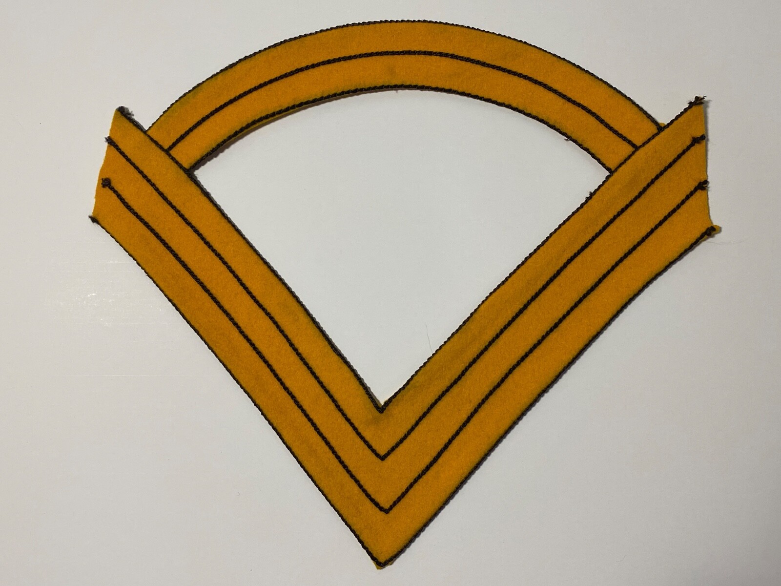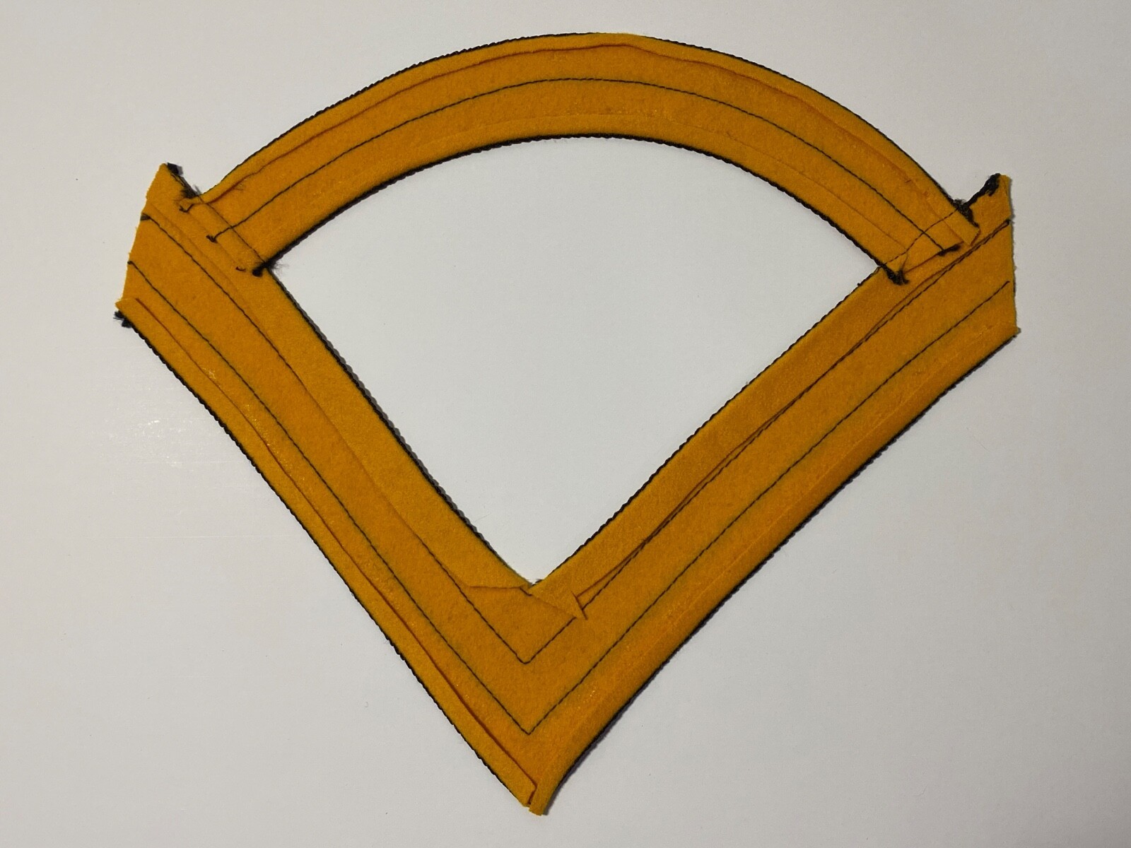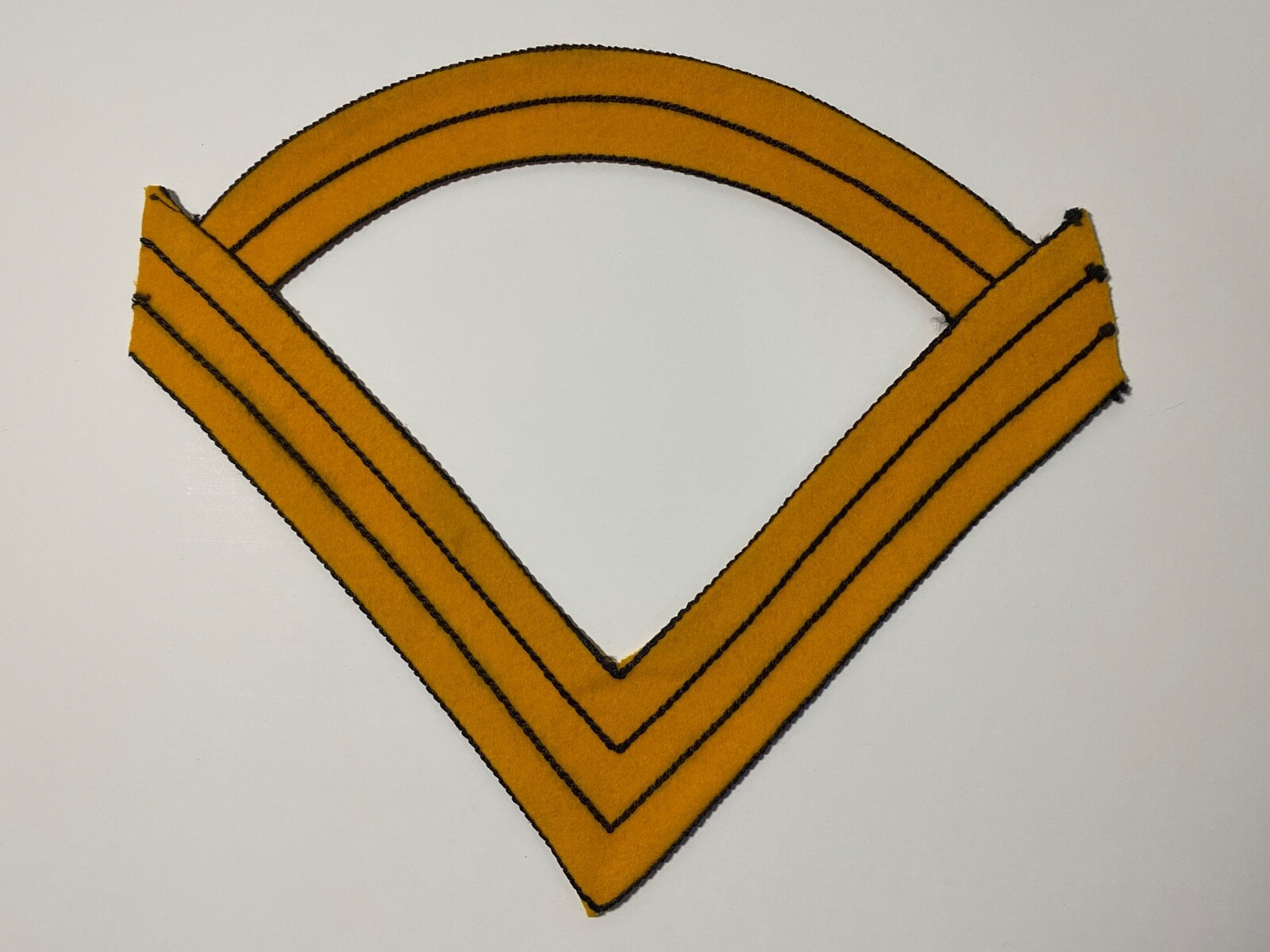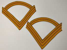 Yellow wool construction with black chain stitching along the borders. These appear to be unused. There is no evidence of use, age, and no moth damage. This matched set of chevrons were worn during the Spanish American War and Indian Wars. Matched set.