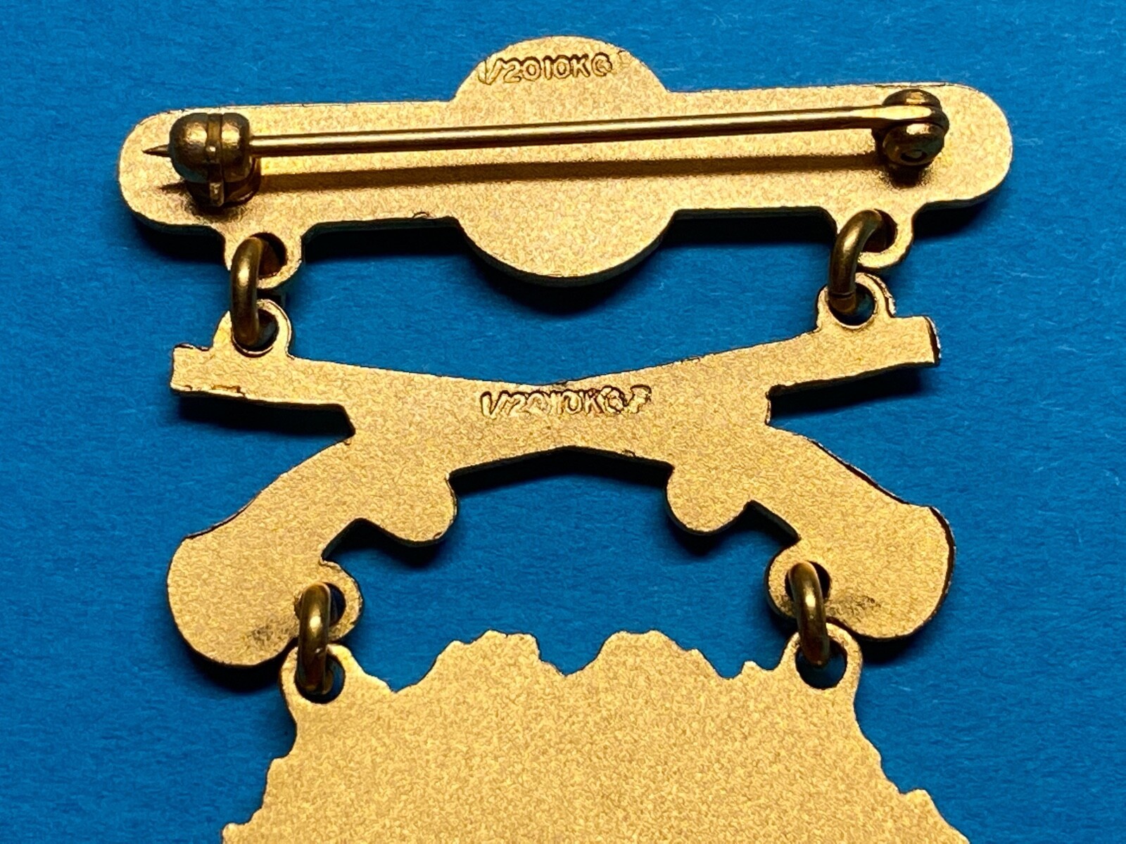 The easiest method to distinguish these clasps is by the markings or hallmarks on the reverse. Original gold-colored clasps dating from the World Wars are marked 14K on the reverse side butt or stock of the weapon. 1955 badges either are not marked (which allows for the false markings at this time) or are marked 1/20 KGF at the weapons intersection